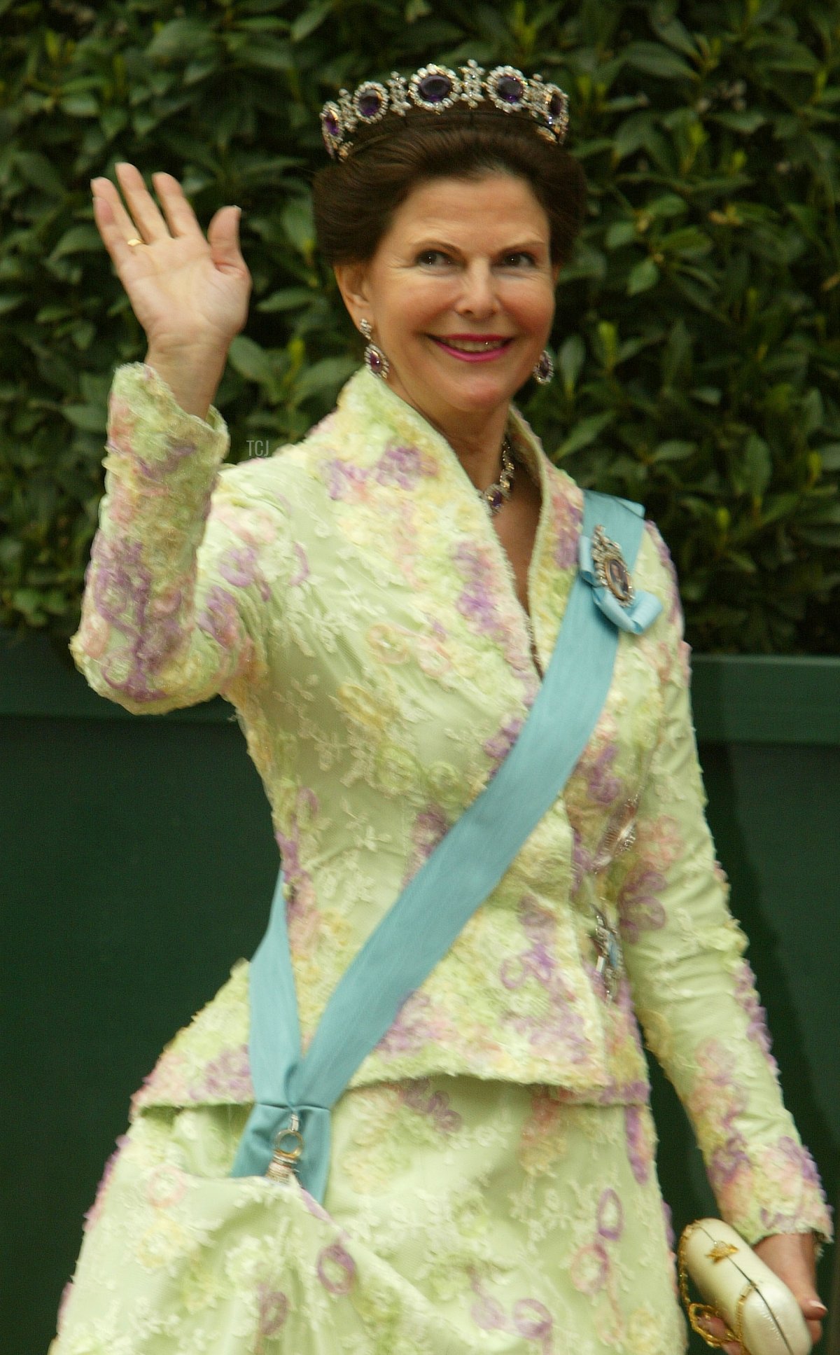 And here, two decades later, she wears the amethysts for the royal wedding of Crown Prince Frederik and Crown Princess Mary of Denmark in Copenhagen in May 2004.