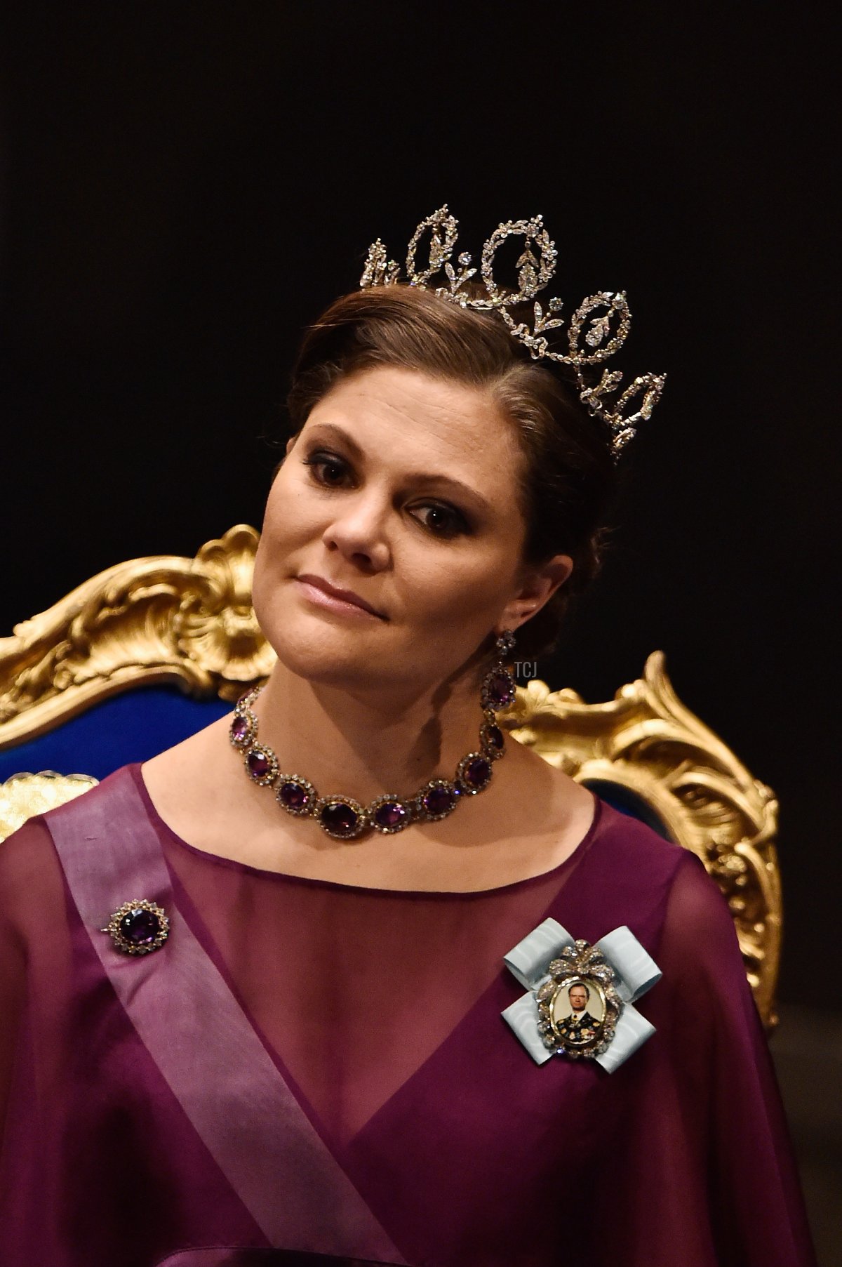 In December 2015, when she was pregnant with Prince Oscar, Victoria wore the amethysts with the Connaught Diamond Tiara for the Nobel Prize ceremony and banquet.
