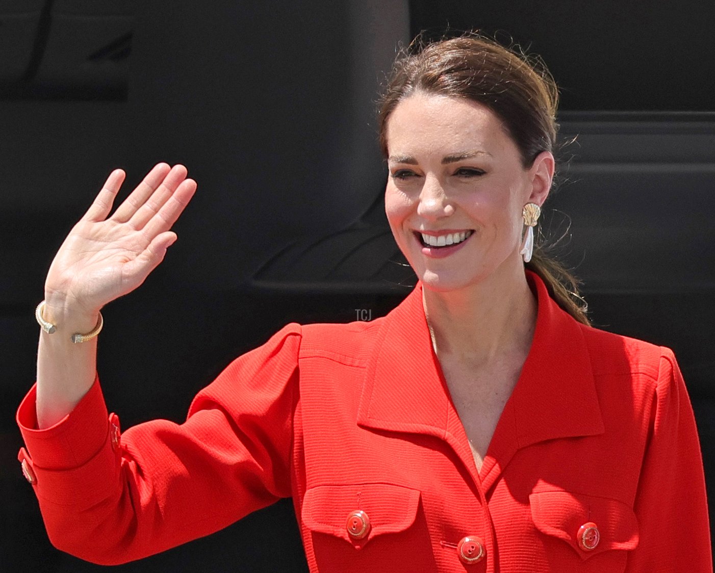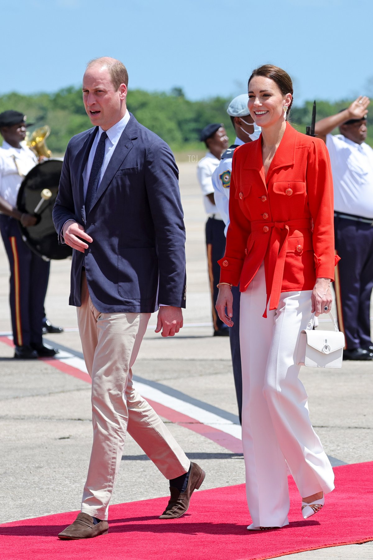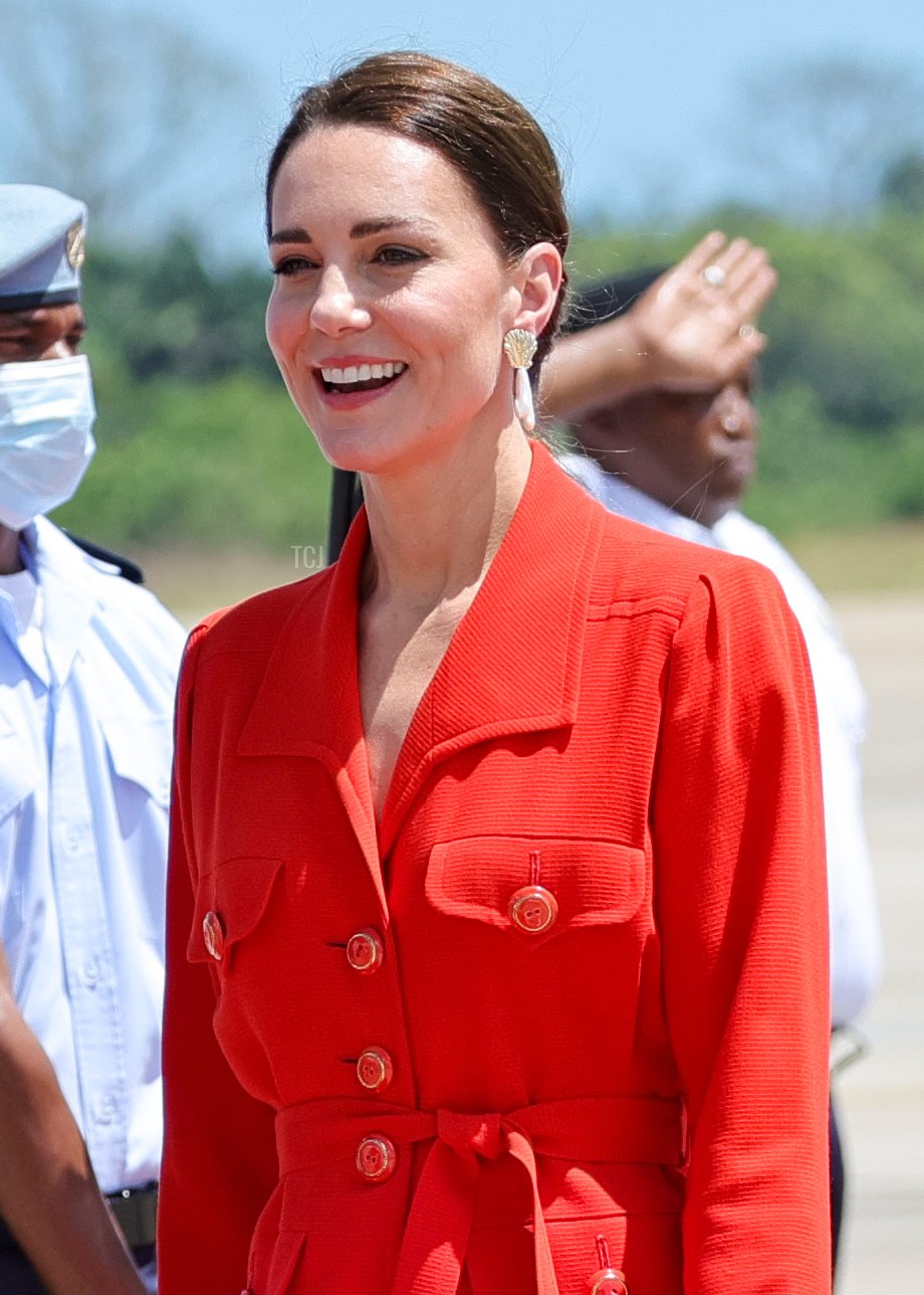 On Tuesday, the Duke and Duchess made a final appearance at the Philip S. W Goldson International Airport in Belize before departing for Jamaica. Kate wore red and white for their departure, including a vintage red Yves Saint Laurent jacket that she bought while at the University of St. Andrews.
