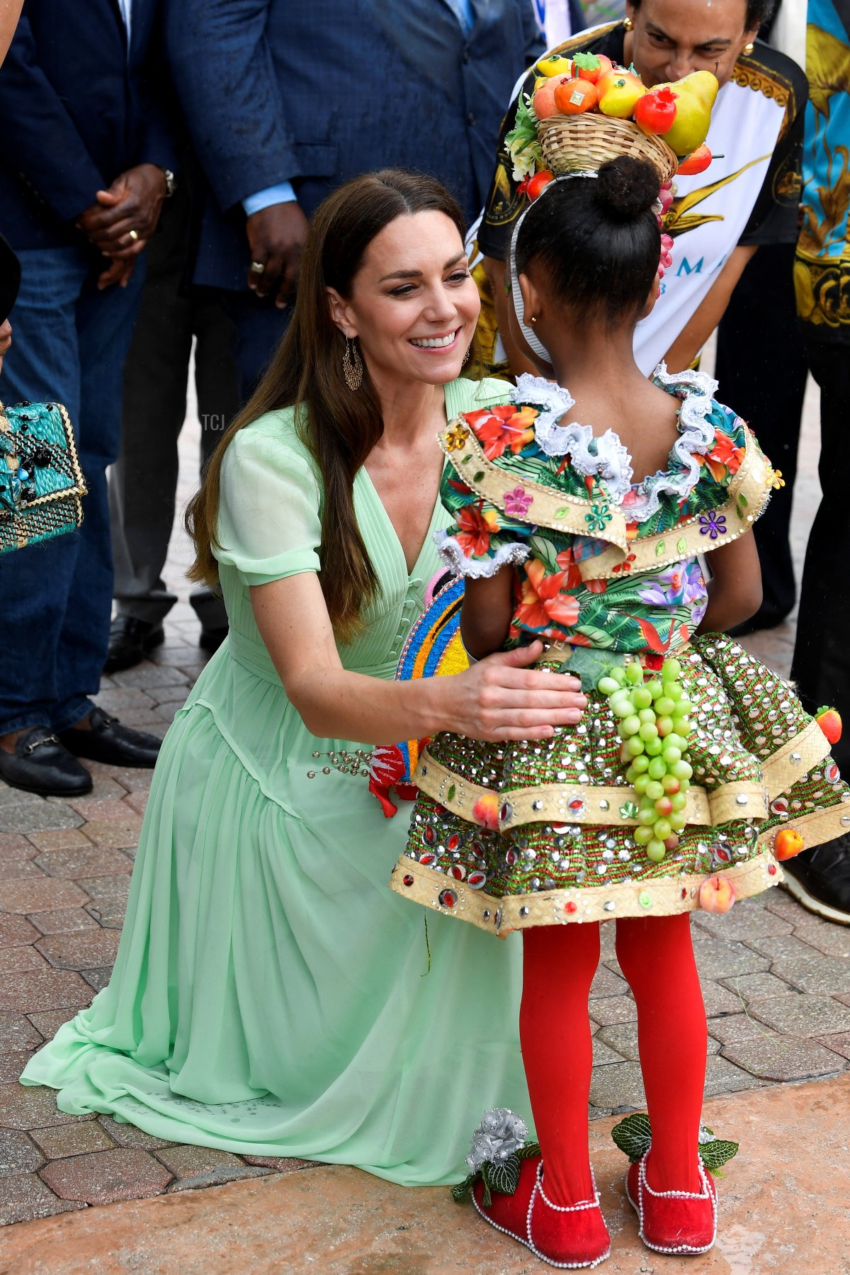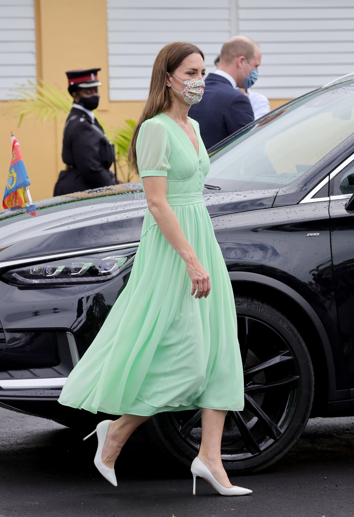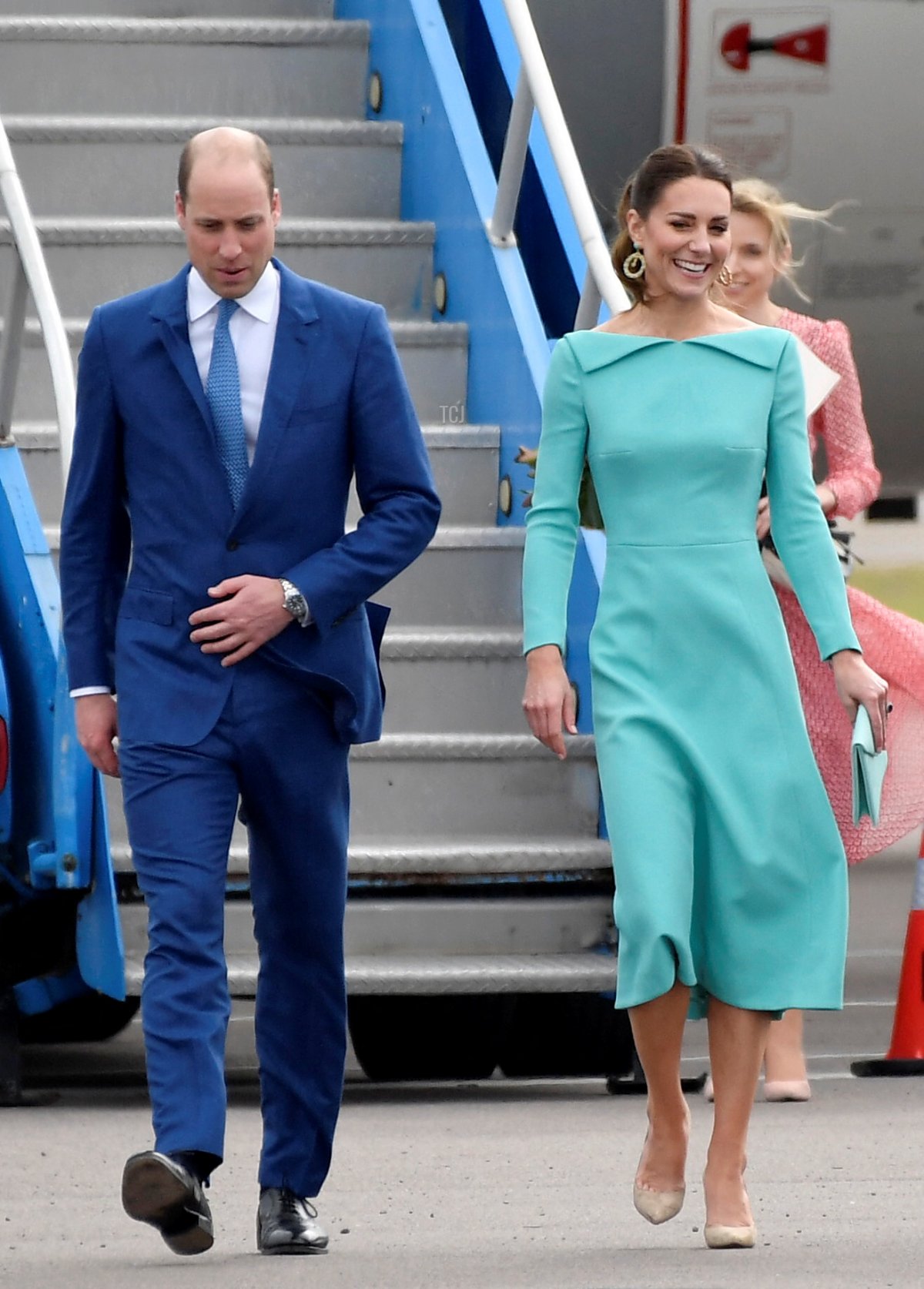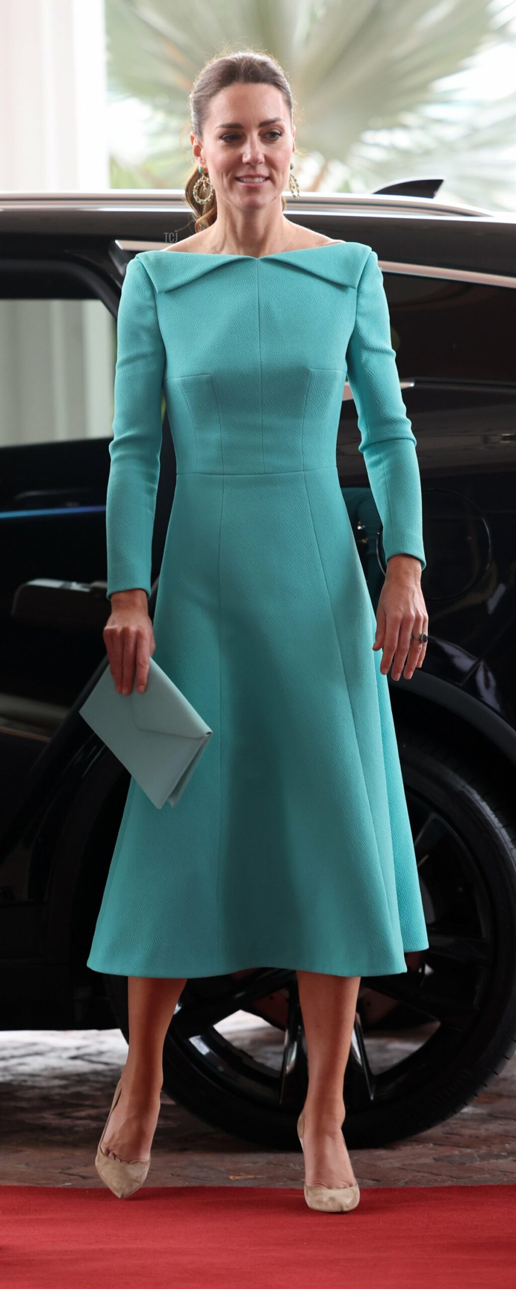 For her arrival in the Bahamas, Kate wore an aquamarine dress from Emilia Wickstead. The color paid tribute to one of the colors in the flag of the Bahamas, a diplomatic nod that Kate has made several times over the course of the tour.