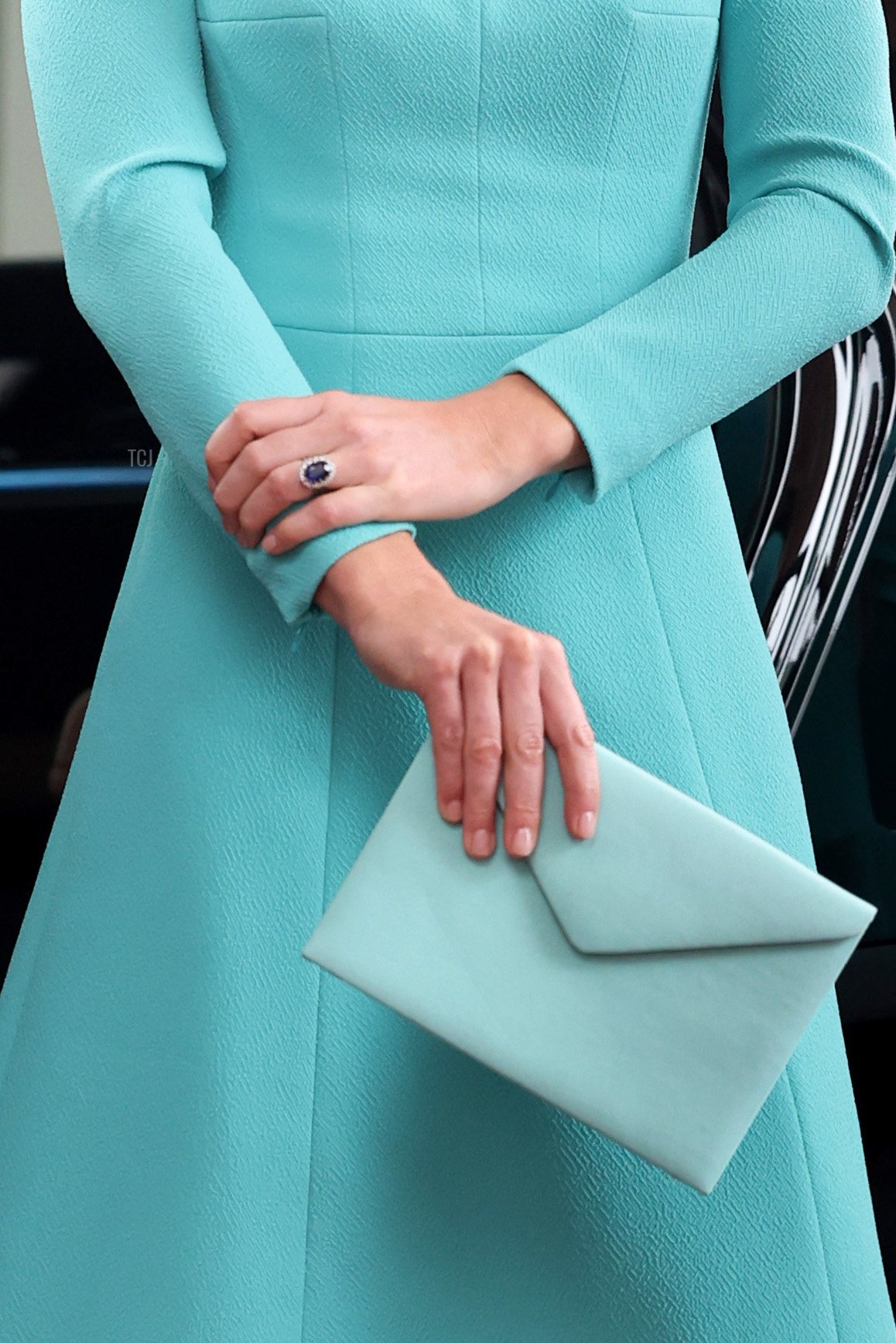 No bracelets with this outfit—Kate just wore her usual trio of rings.