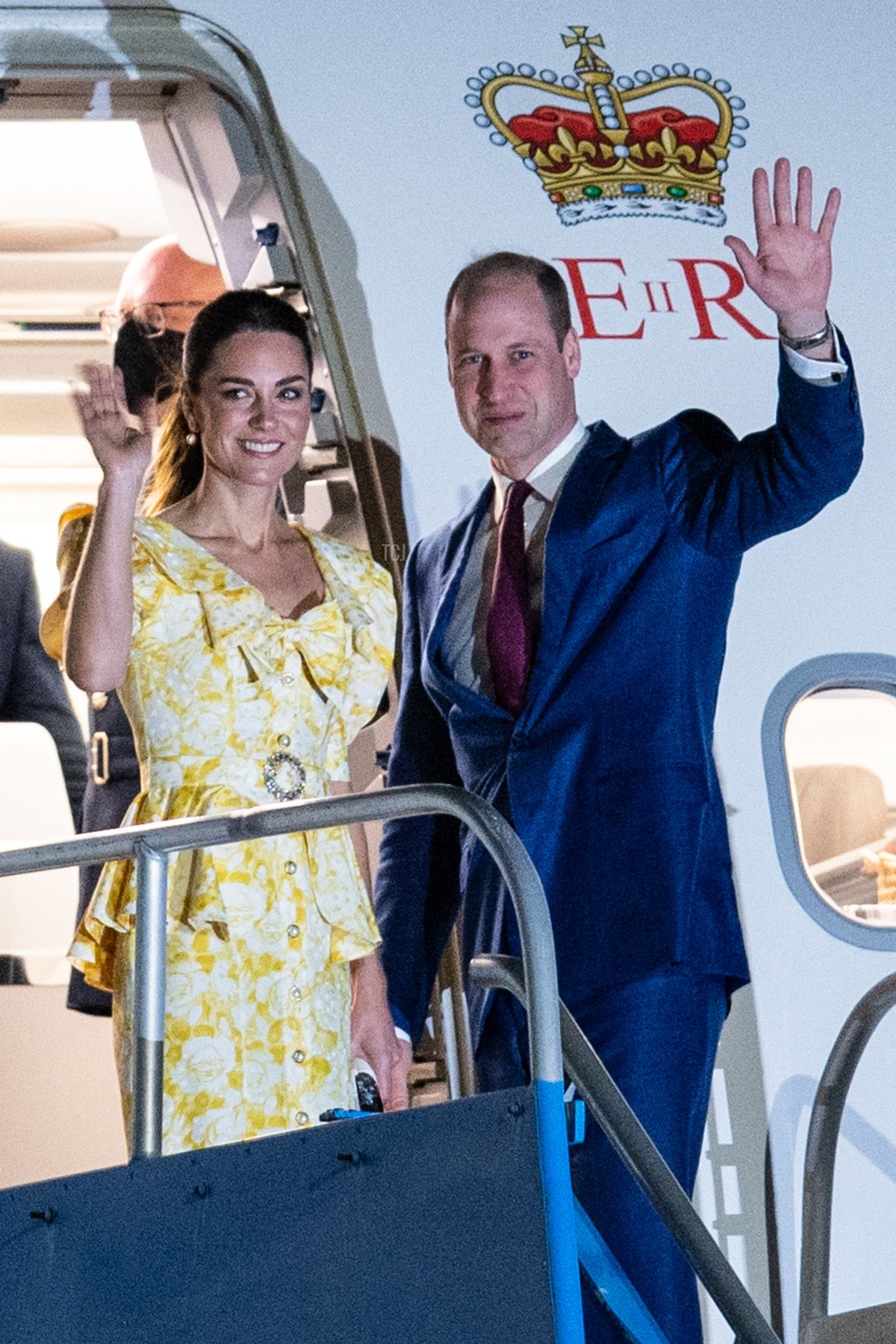 Kate wore a yellow and white Alessandra Rich dress, which featured throwback ’80s-inspired details, for the official departure ceremony.