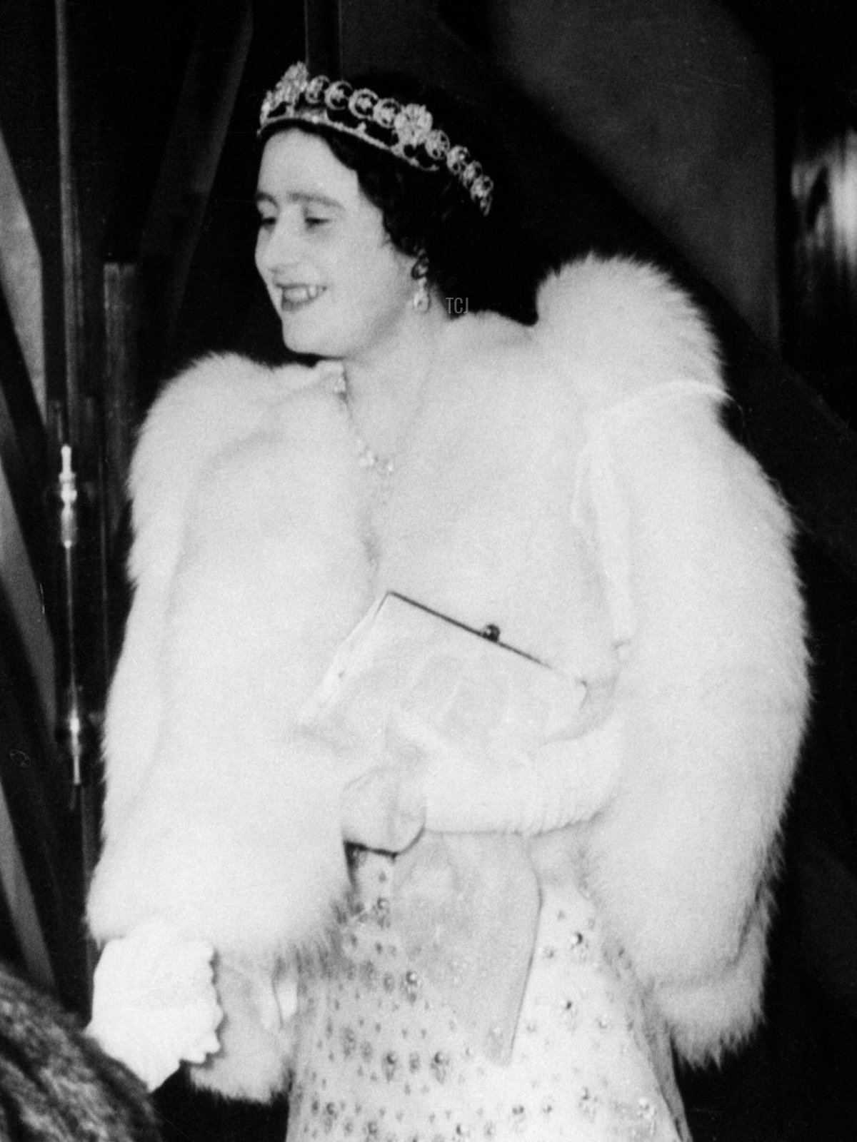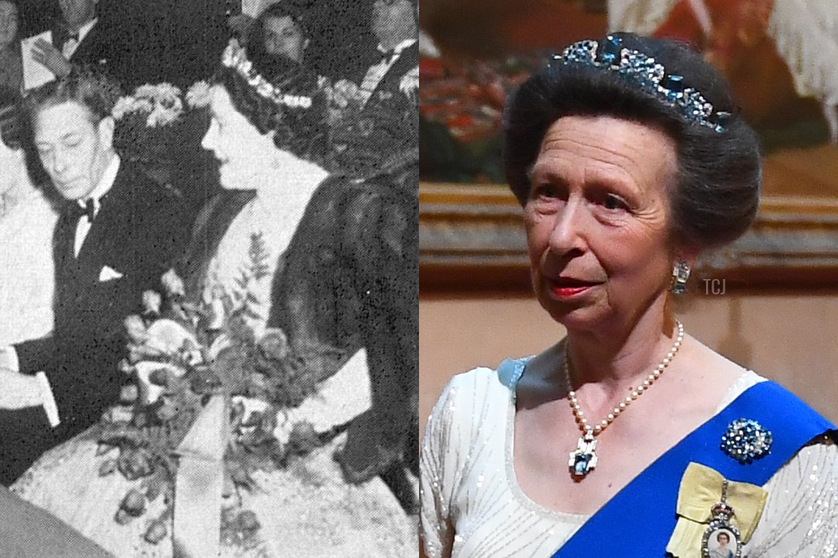 This unusual diamond and aquamarine tiara, with its pinecone-inspired design, was also made by Cartier. It was another anniversary present from Bertie to Elizabeth, who by that time were King George VI and Queen Elizabeth. Elizabeth only wore it a few documented times, including the appearance above, from December 1950. In 1973, Elizabeth (then the Queen Mother) passed the tiara along to her granddaughter, Princess Anne, who still wears it today, after making a few alterations to the piece. (Anne has also worn another tiara that reportedly belonged to the Queen Mother: the Double Meander Bandeau.)