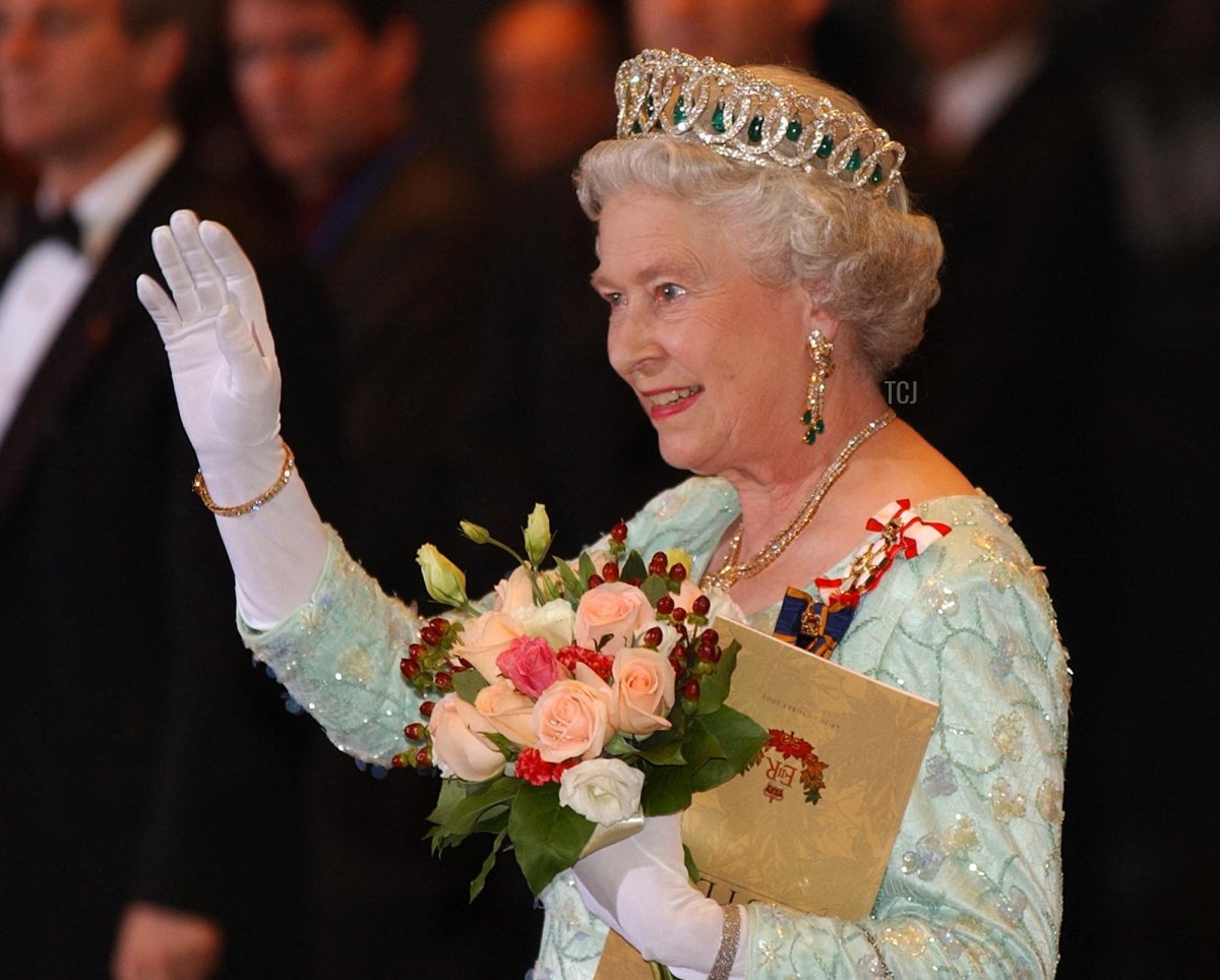 The Queen paired it with another suite of emerald jewels. This modern diamond and emerald demi-parure has been in the news recently, as the Queen loaned it to the Duchess of Cambridge for a royal tour. The suite consists of a pair of earrings, a necklace, and a bracelet, all worn by the Queen in Canada for this 2002 gala.