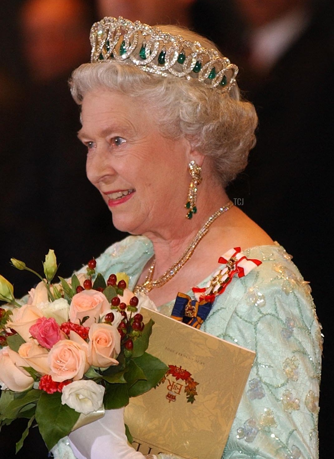 She was escorted at the black-tie gala by Prime Minister Jean Chretien. For the occasion, she wore a light green evening gown with floral embroidery. She also wore the insignia of two Canadian decorations: the Order of Canada and the Order of Military Merit.