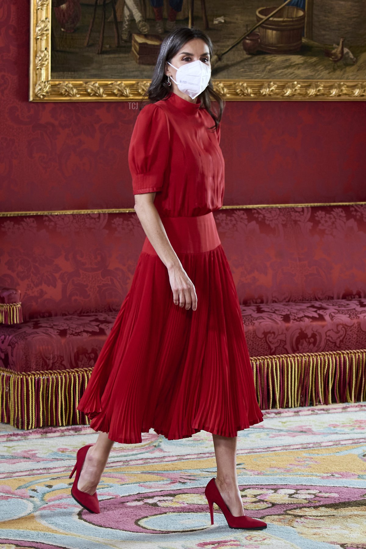 For the occasion, Queen Letizia wore a red day dress with a drop waist and a pleated skirt, plus matching red shoes.