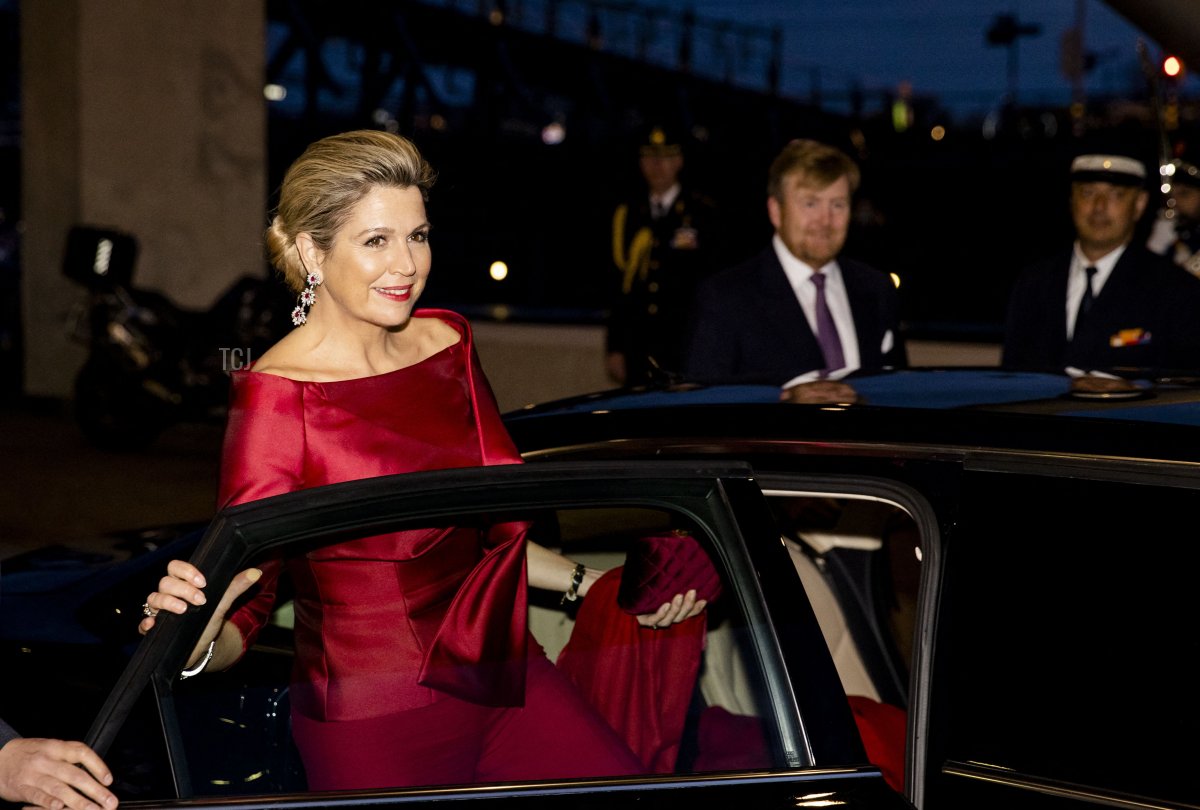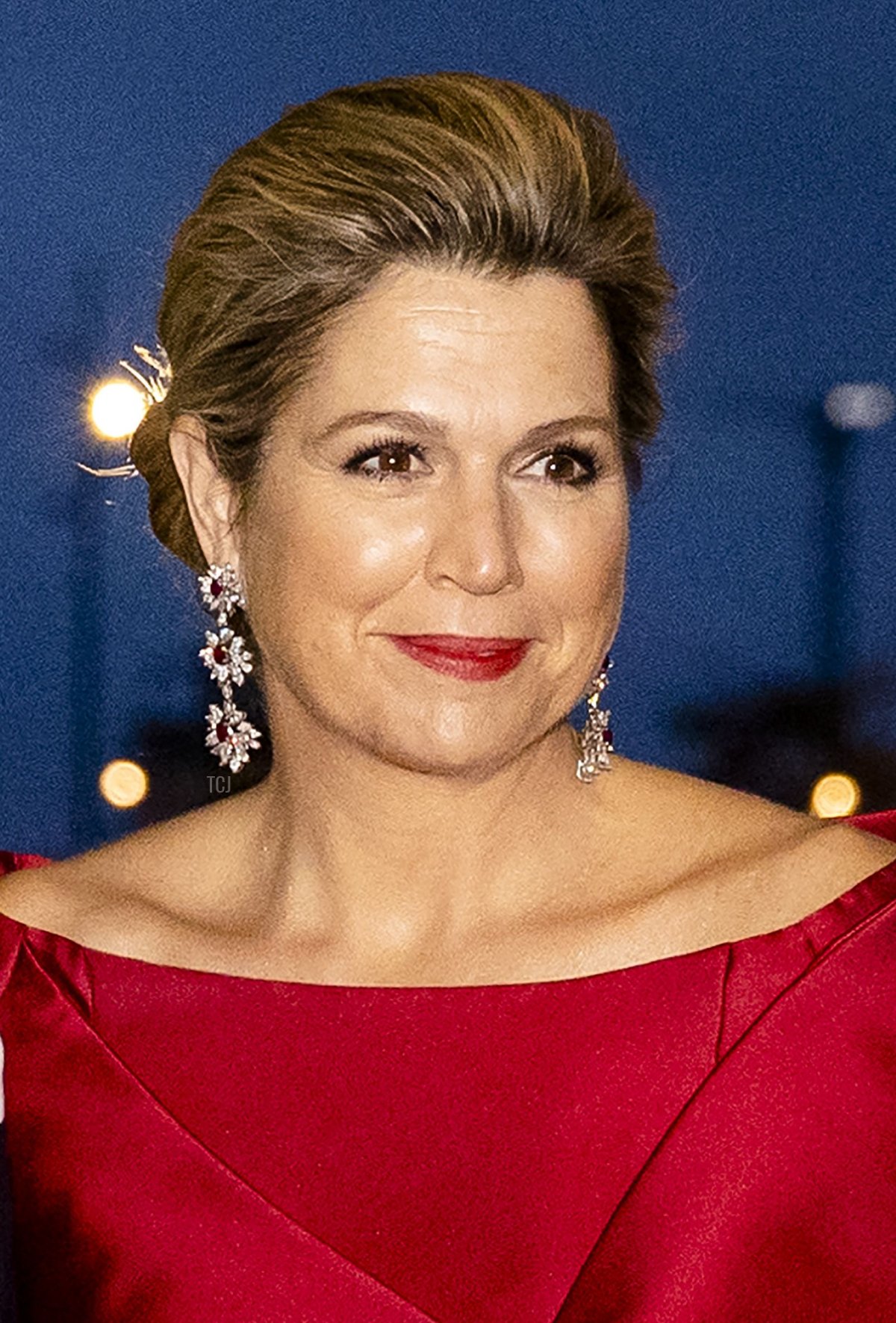 Fittingly, she chose jewels set with diamonds and rubies as her accessories. These included her ruby and diamond floral statement earrings, which are part of her private jewelry collection. She also wore her diamond and ruby ring, which was a gift from her husband to mark the birth of Princess Amalia, on her right hand. (You can read about all four of the rings Willem-Alexander has given her over here!)