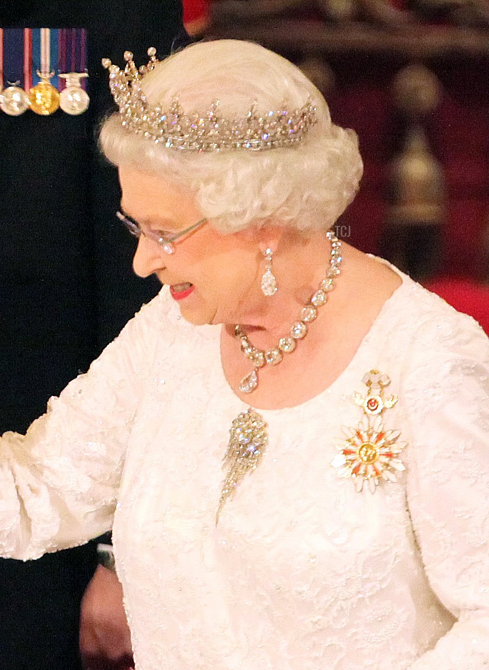 After the Queen Mother’s death in 2002, they were inherited by the Queen, who has worn them occasionally at formal events like state banquets. Here, she wears the earrings with the Girls of Great Britain and Ireland Tiara, the Coronation Necklace, and Queen Victoria’s Diamond Fringe Brooch for a banquet during the Turkish state visit in 2011.