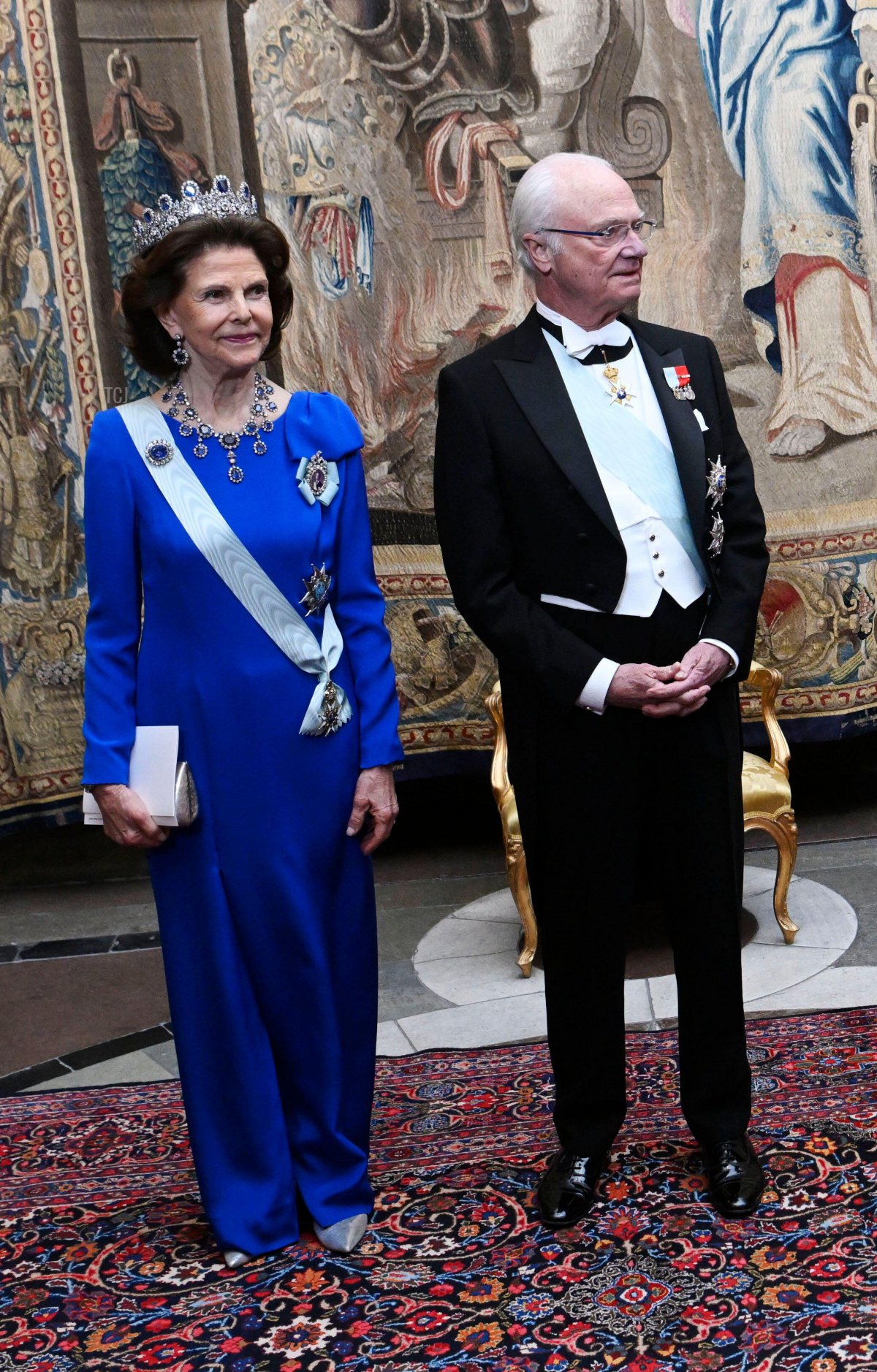 King Carl XVI Gustaf and Queen Silvia led the senior members of the royal family in attendance at the dinner. Queen Silvia wore a gorgeous royal blue evening gown with silver accessories and a pair of decorations: the Order of the Seraphim and the King’s Royal Family Order.