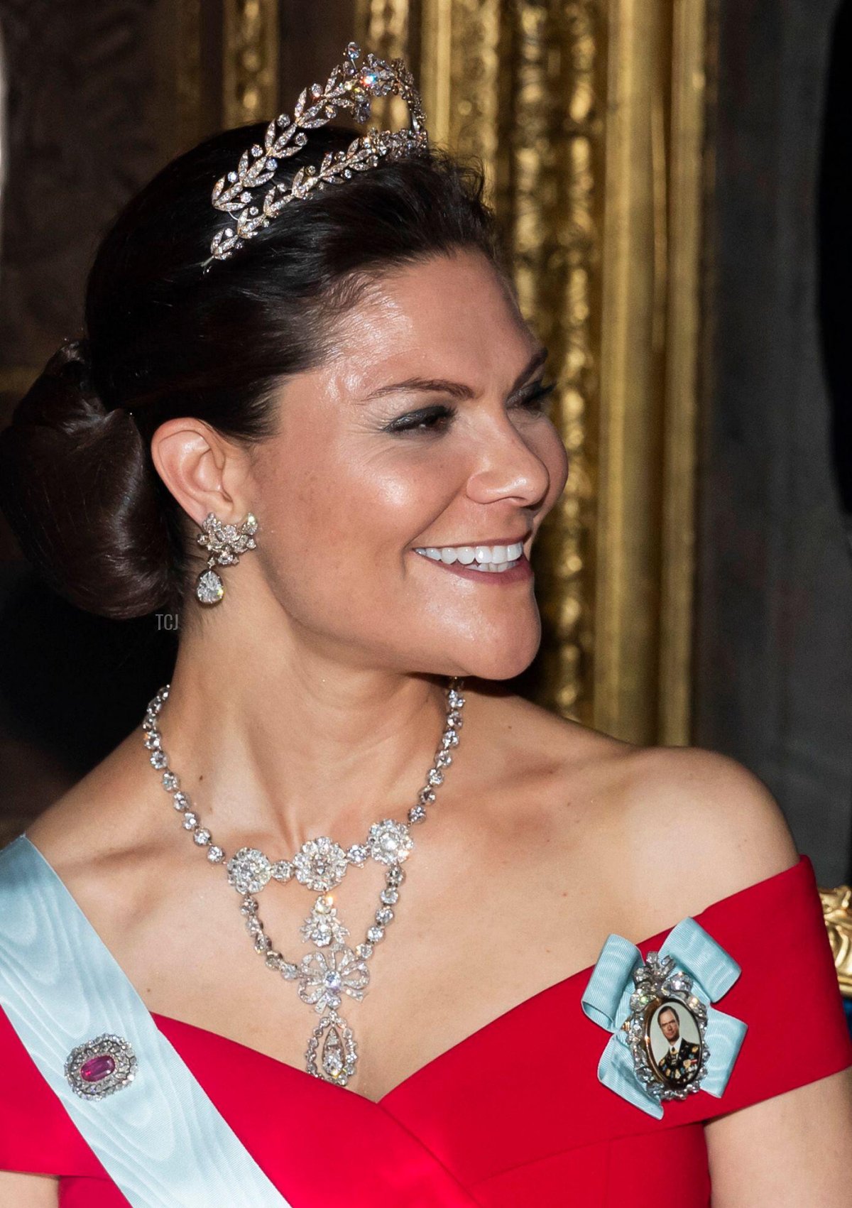 Crown Princess Victoria’s jewelry for the evening was, appropriately, set with diamonds and rubies. She wore the Boucheron Laurel Wreath Tiara, a jewel that originally belonged to her great-grandmother, Princess Margaret of Connaught. The tiara was later a favorite of Princess Lilian, who bequeathed it to Victoria in her will. Lilian loved to wear the tiara with Queen Josefina’s Diamond Stomacher Necklace, and Victoria has also paired the two jewels for this dinner.