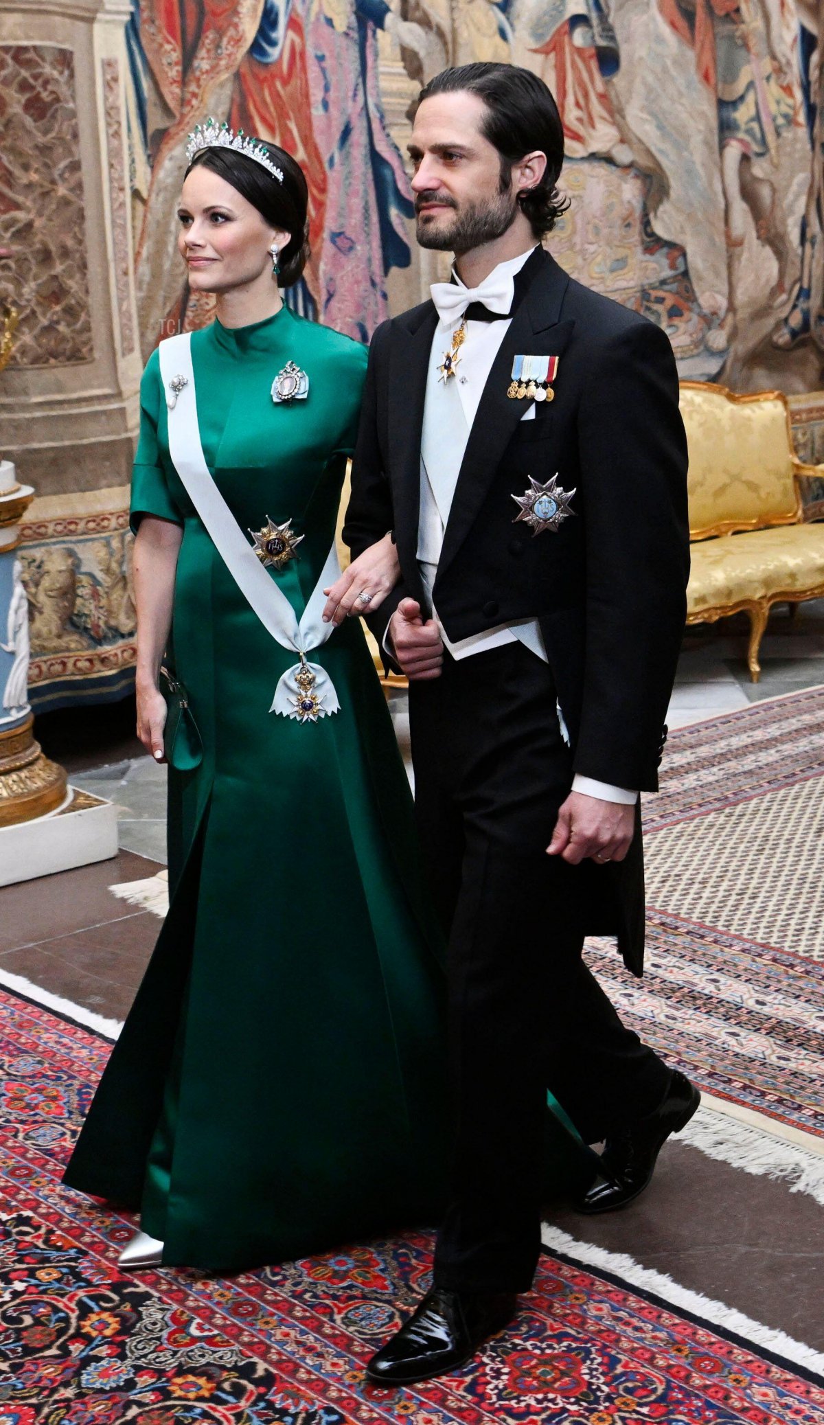 Prince Carl Philip and Princess Sofia arrived next. Sofia was dazzling in emerald green for the dinner, wearing an evening gown that she previously wore for the Nobel Prize banquet in Stockholm in December 2016. She carried a matching green clutch bag and wore silver shoes for the dinner, as well as the sash and star of the Order of the Seraphim and the King’s Royal Family Order.