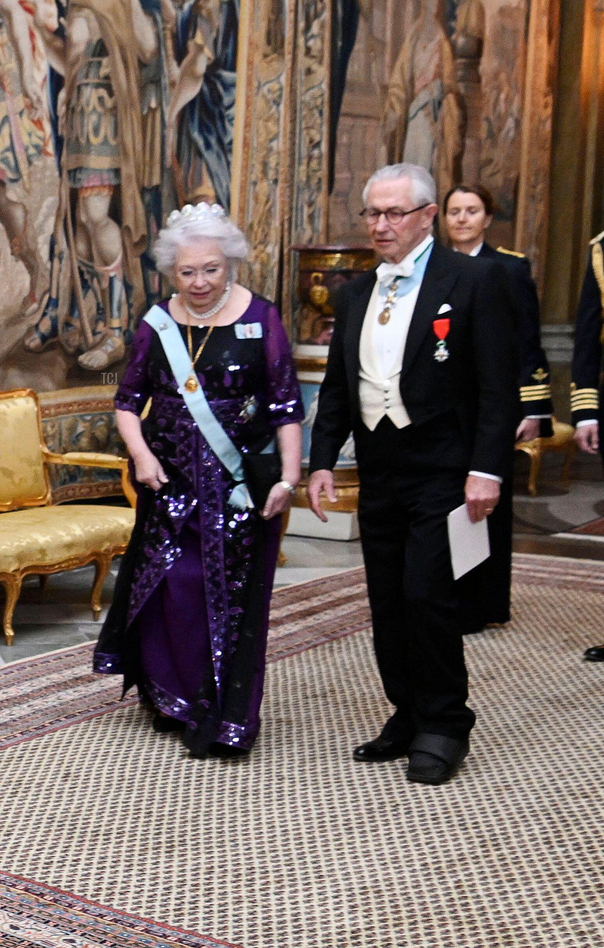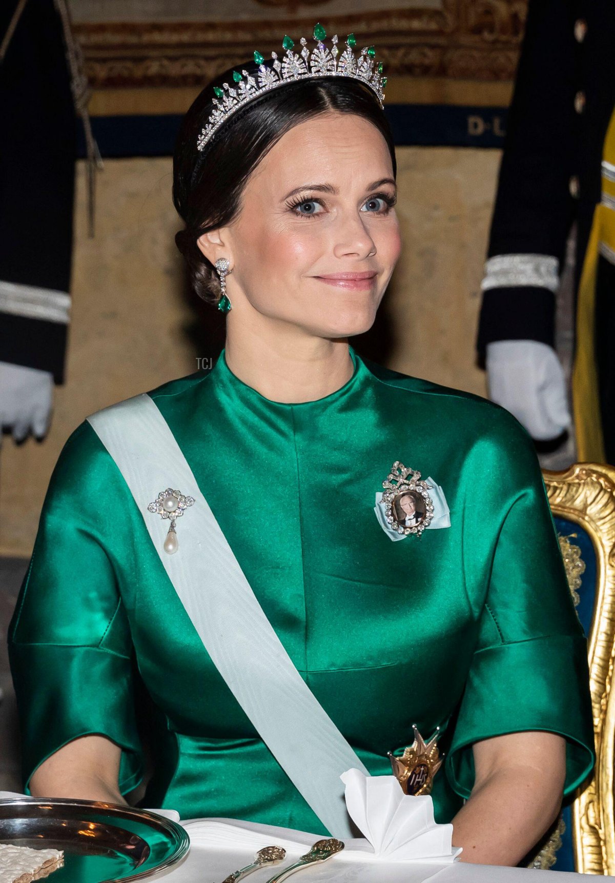 The King’s sister, Princess Christina, and her husband, Tord Magnuson, also attended the dinner. Christina wore diamonds and pearls, including the Diamond Six-Button Tiara, with the purple evening gown she wore for the Nobels in 2017.