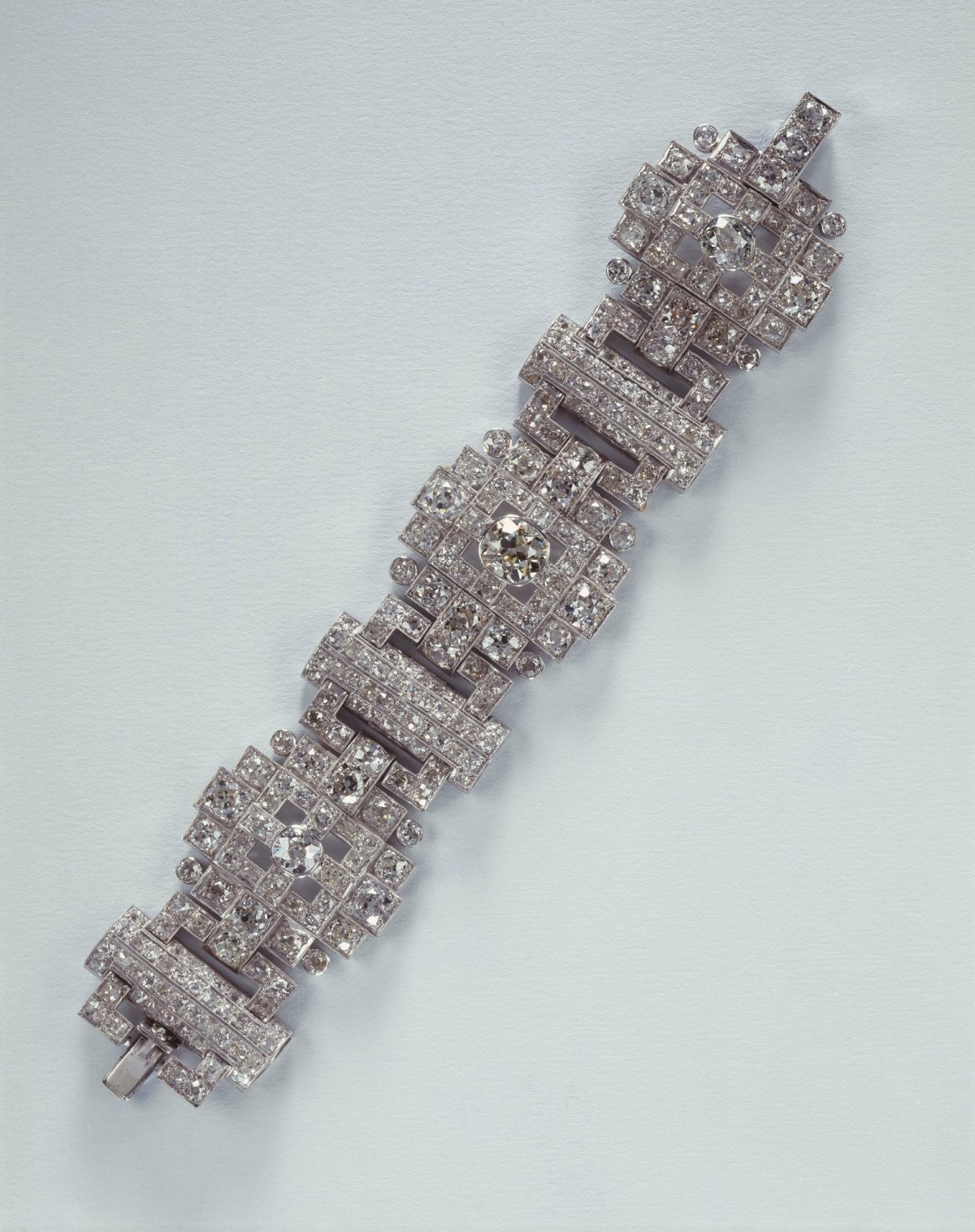 Only three diamonds from the tiara were needed to make the engagement ring, so there were plenty left over to make a magnificent wedding present for Philip to give to his royal bride. In The Queen’s Diamonds, Sir Hugh Roberts describes the bracelet as having “the form of three stepped millegrain and pavé-set links, each centered by an old brilliant in rub-over setting.”