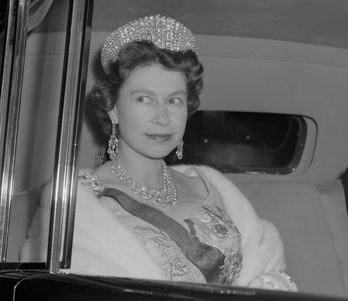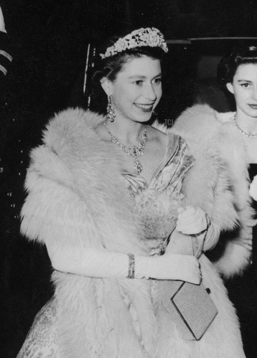 Princess Elizabeth began wearing the earrings for gala occasions from the earliest years of her royal marriage. Here, she wears the earrings for the first Royal Variety Performance of her reign, which took place in November 1952. She wore the earrings with the Nizam of Hyderabad Tiara and its coordinating necklace, plus Queen Mary’s diamond bangles.