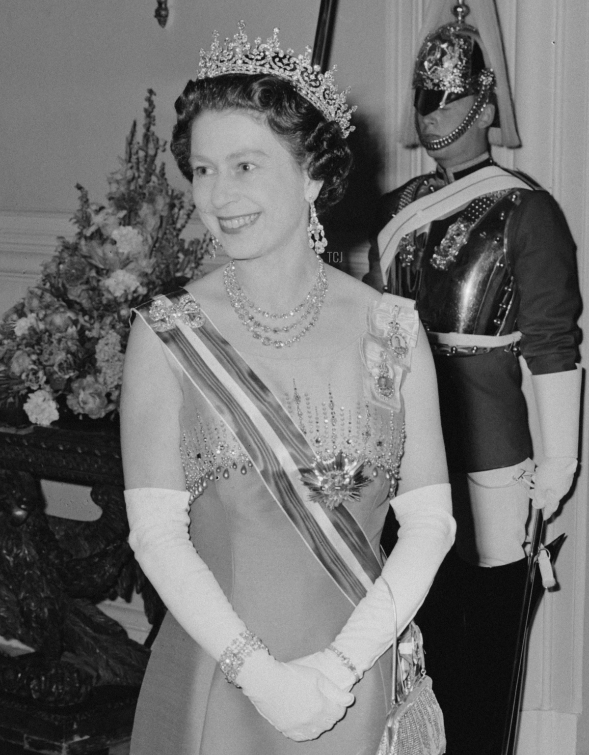 Throughout her reign, the Queen has often worn the earrings for important gala occasions, like state banquets and receptions. Here, in May 1969, she wears the earrings for a dinner at the British Embassy in Austria. She paired them with additional diamond jewels, including the Girls of Great Britain and Ireland Tiara, the Diamond Festoon Necklace, the Dorset Bow Brooch, and Queen Victoria’s Diamond Bracelet.