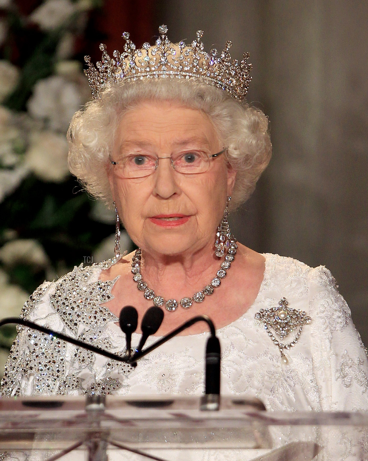 As the Queen has gotten older, she has generally preferred to wear different (often smaller) pairs of earrings. One of her last prominent appearances in the chandelier earrings came in July 2010, when she wore them with additional jewels (the Girls of Great Britain and Ireland Tiara, Queen Alexandra’s Diamond Collet Necklace, and Queen Victoria’s Diamond Jubilee Brooch) for a dinner at the Royal York Hotel in Toronto.