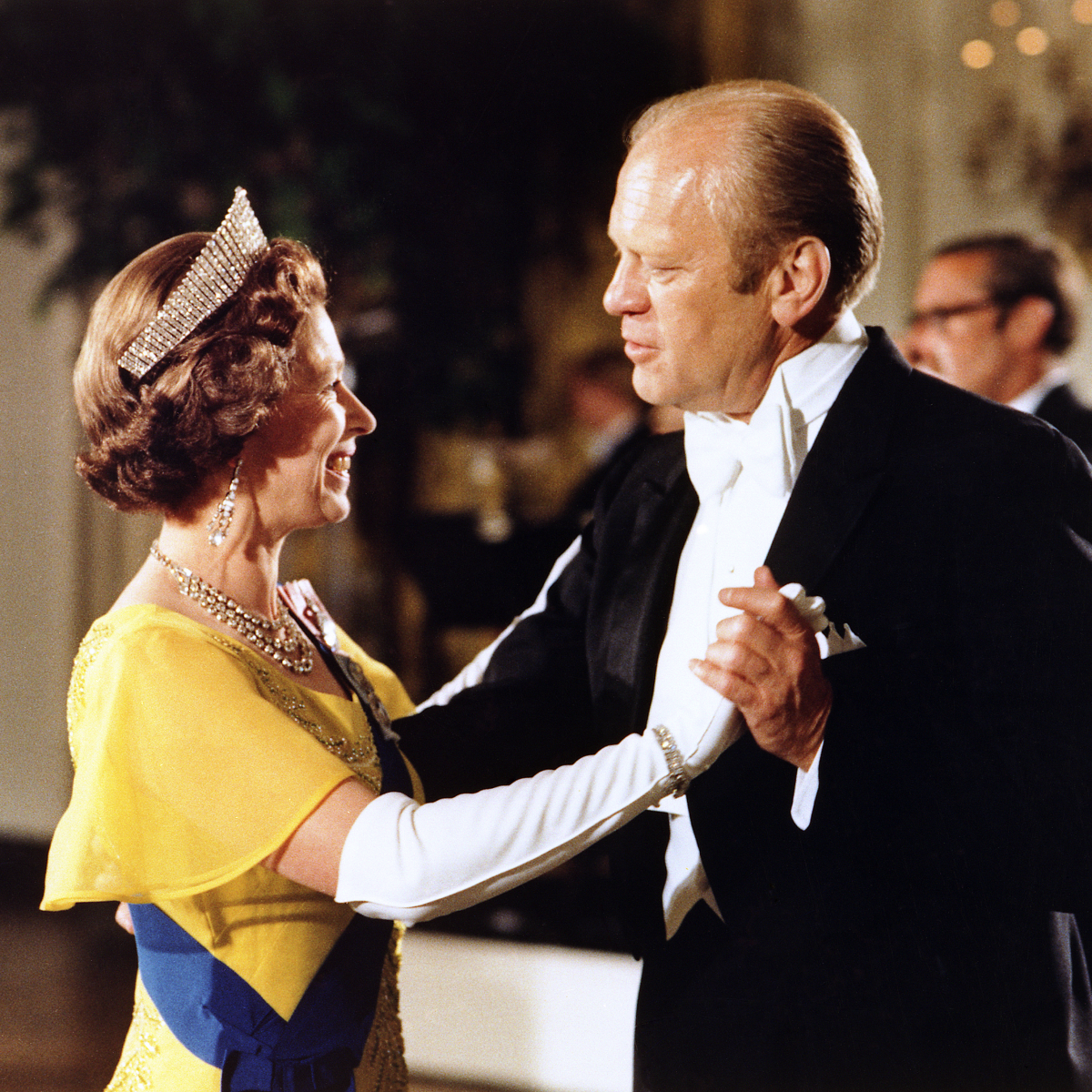 In July 1976, the Queen danced in the earrings with President Gerald Ford at the White House in Washington, D.C., during a state visit. She also wore Queen Alexandra’s Kokoshnik and the Diamond Festoon Necklace with her canary yellow gown.