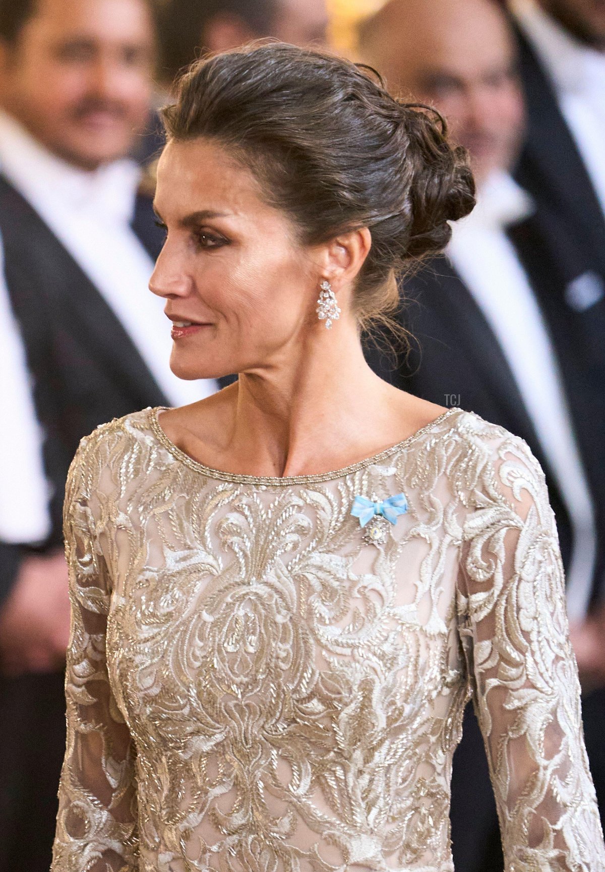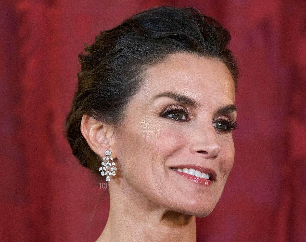 Queen Letizia made a dazzling appearance at a state dinner in Madrid on Tuesday, wearing a gorgeous pair of glittering diamond earrings.