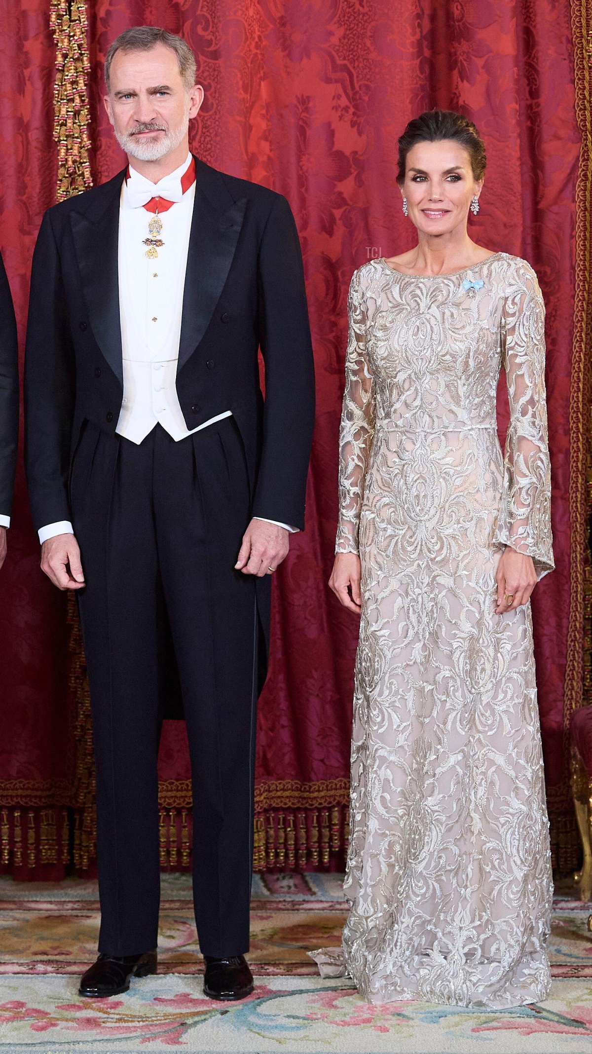 King Felipe VI and Queen Letizia were elegant in their formal attire for the banquet. Felipe wore white tie, with the badge of the Order of the Golden Fleece around his neck. Letizia was gorgeous in a champagne-colored gown with an intricate lace overlay. (Queen Letizia Style identified the dress as a Gabriel Lage design.) She pinned the small ribbon and badge of the Order of Carlos III to the bodice of her gown.