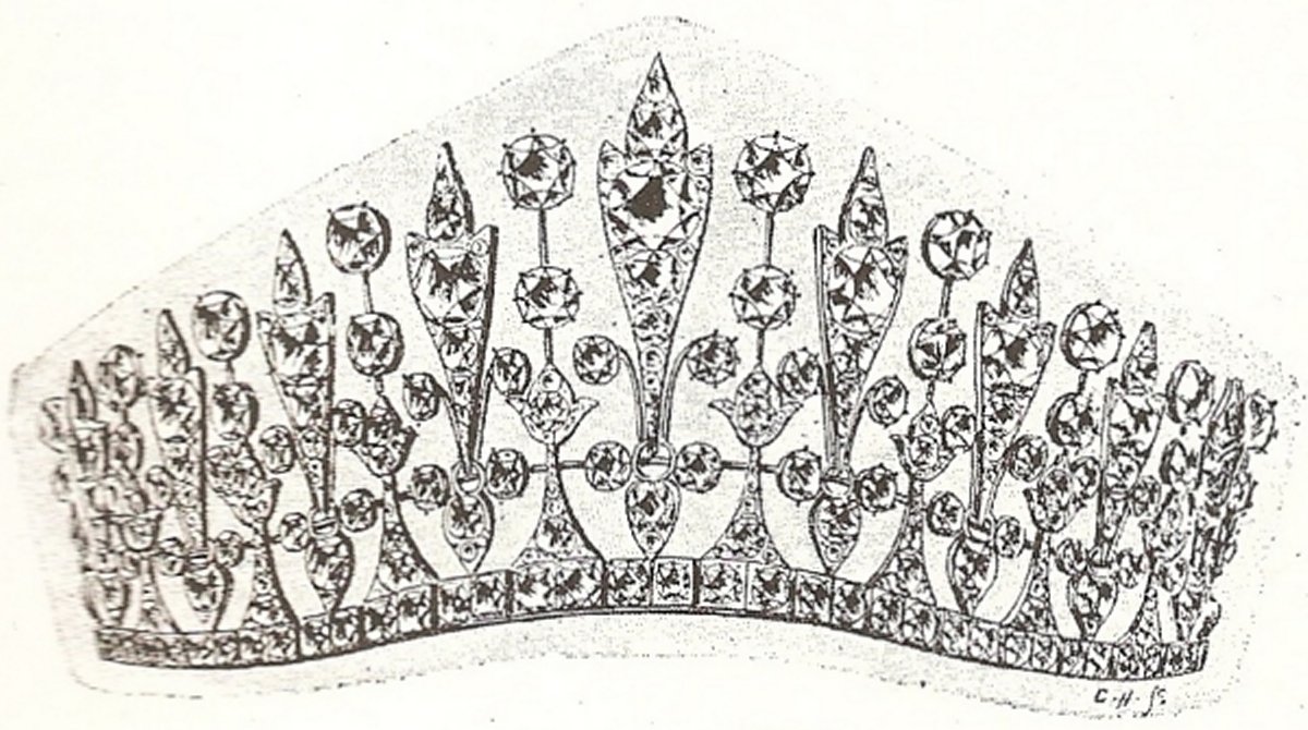 Funds for the tiara (pictured above as part of an illustrated list of the wedding presents) had been collected from Surrey residents by subscription, with Lovelace’s second wife, Jane, helping to organize the effort. Contemporary newspaper reports described the tiara as designed “in the Empire style. The centre is formed of a tapering upright, two and three-quarter inches in length, with scroll sides, holding large single diamonds, and supported by a fleur-de-lis base surmounting a band of single diamonds. On each side of the centre there is an upright ray, with three important single brilliant. The same design is repeated in gradations throughout, and has an unusually graceful effort, whether worn as a tiara or as a necklace. The gift, which cost £1,200, contains over 300 brilliants, many of large size.”