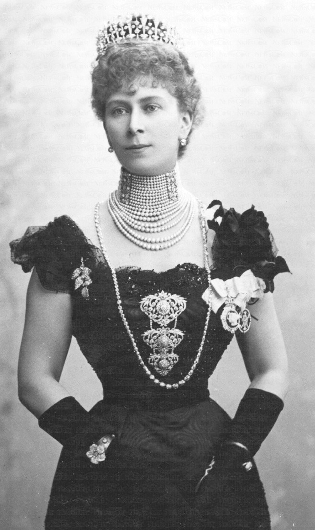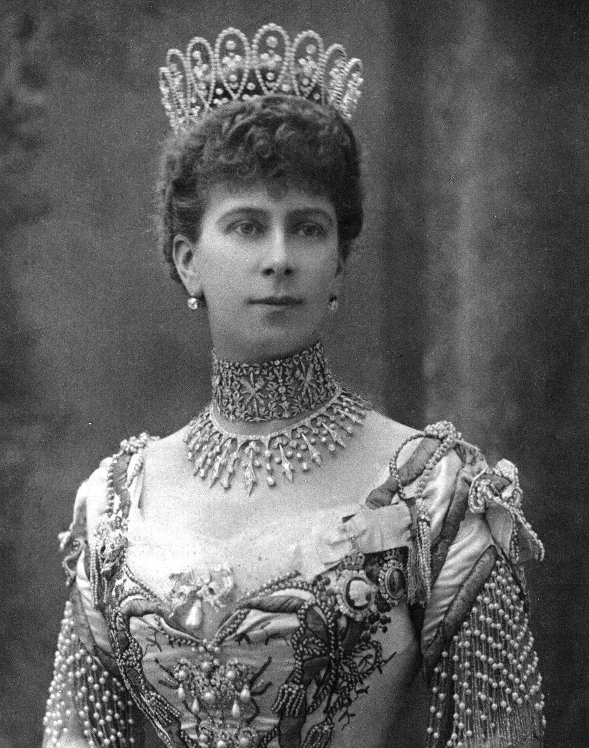 In this portrait from 1905, she pairs the Surrey Necklace with two new-to-her jewels: the Love Trophy Collar (made by Garrard in 1901) and the Boucheron Loop Tiara (made in 1902 using diamonds that had been given to her by De Beers during the imperial tour). The Love Trophy Collar is still in the Buckingham Palace Vaults today, but the Boucheron Loop Tiara was later broken up (to make the Delhi Durbar Tiara).