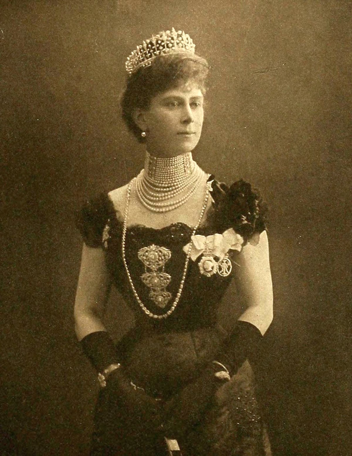 With the dark ensemble, she wore diamonds and pearls, including the County of Surrey Tiara. Other jewels worn in this portrait session include her eleven-row pearl choker necklace, with its distinctive diamond spacer sections, and the Kapurthala Stomacher, a grand diamond ornament given to her as a wedding present by the Maharajah of Karpurthala. The choker necklace is now worn by the Duchess of Gloucester, while the stomacher was redesigned and now belongs to the Queen.