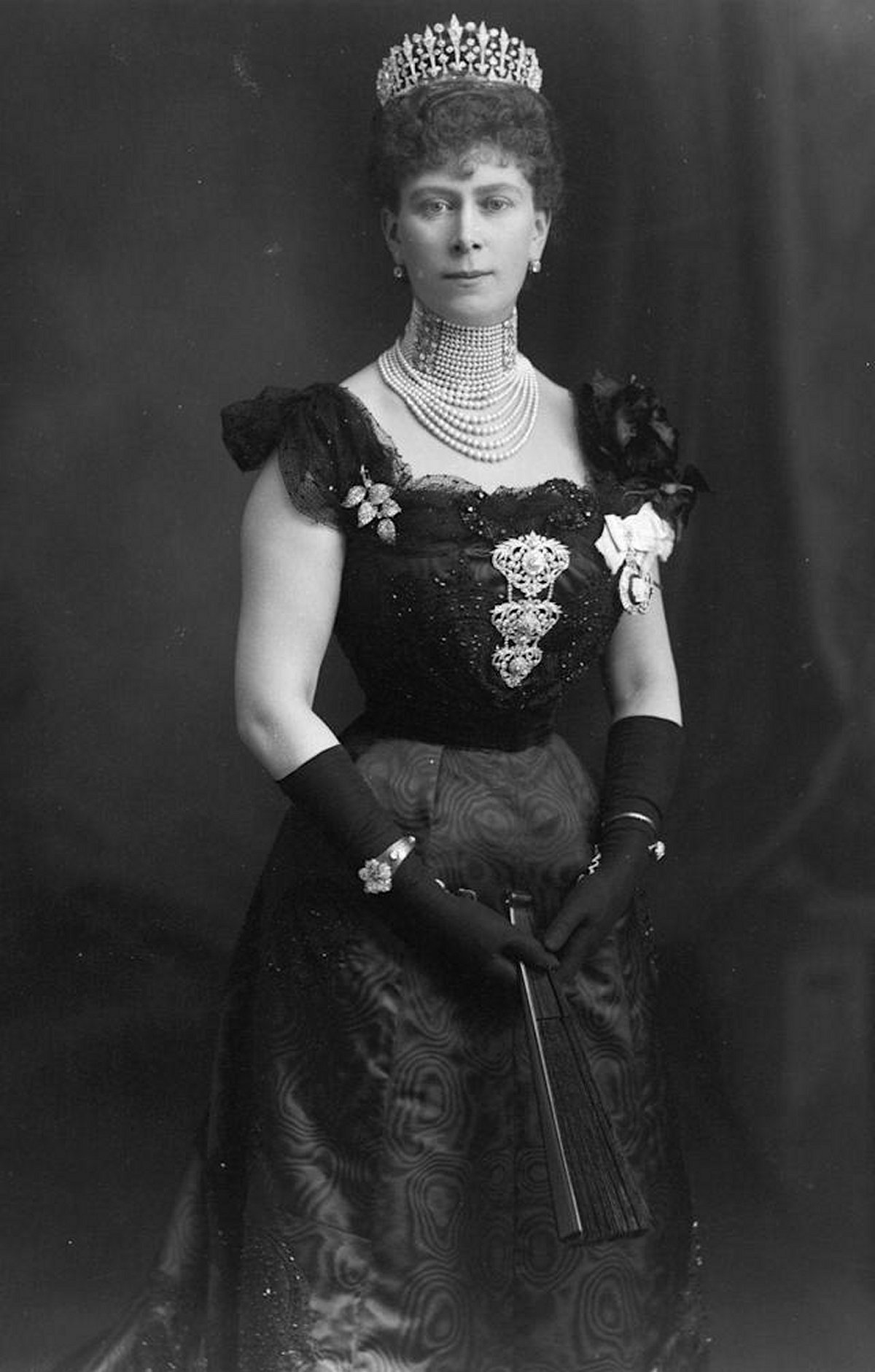 Mary wore the tiara setting of the piece for a famous series of portraits taken in London by W. & D. Downey in March 1901. The photographs were taken ahead of Mary and George’s eight-month tour of the Empire, visiting all corners of the globe following the accession of King Edward VII. In the images, May still wears a dark dress and gloves, as the court was still in mourning for Queen Victoria. Indeed, an entire wardrobe of black clothing was made for her to wear on the tour.