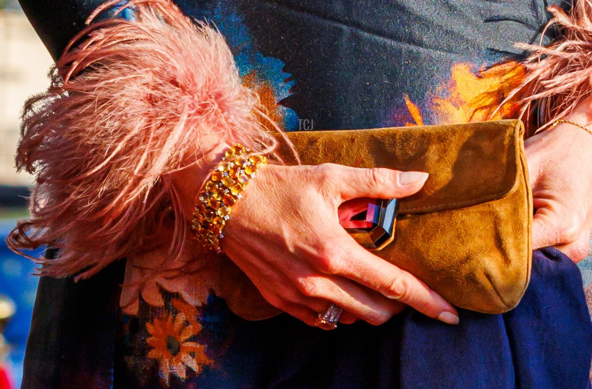 Queen Máxima, as usual, brought some serious fun along with her via her outfit. She wore a floral printed dress in shades of blue and orange with orange feathered trim at the cuffs. She also carried an orangey-tan clutch bag with a large orange gem-like clasp.