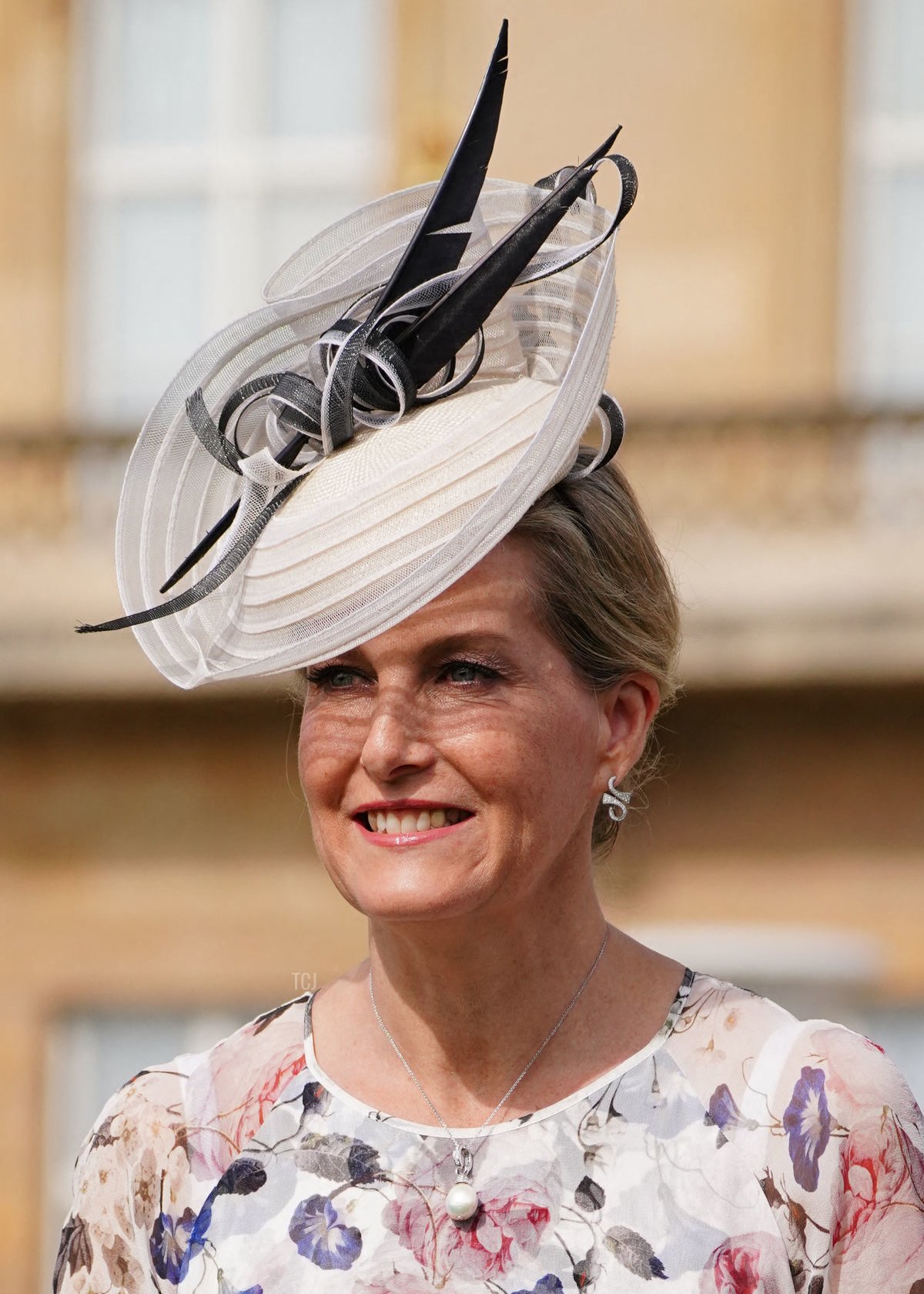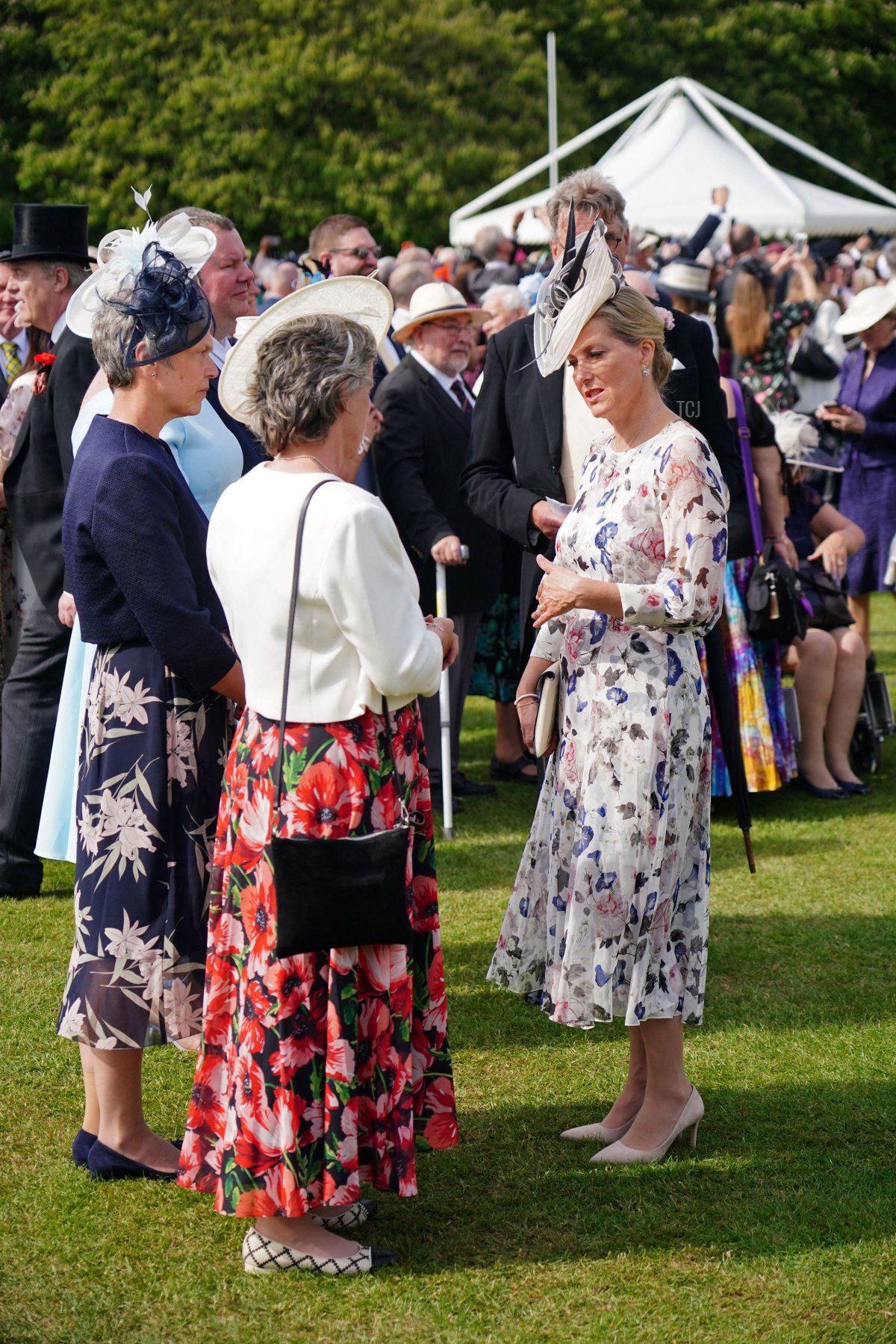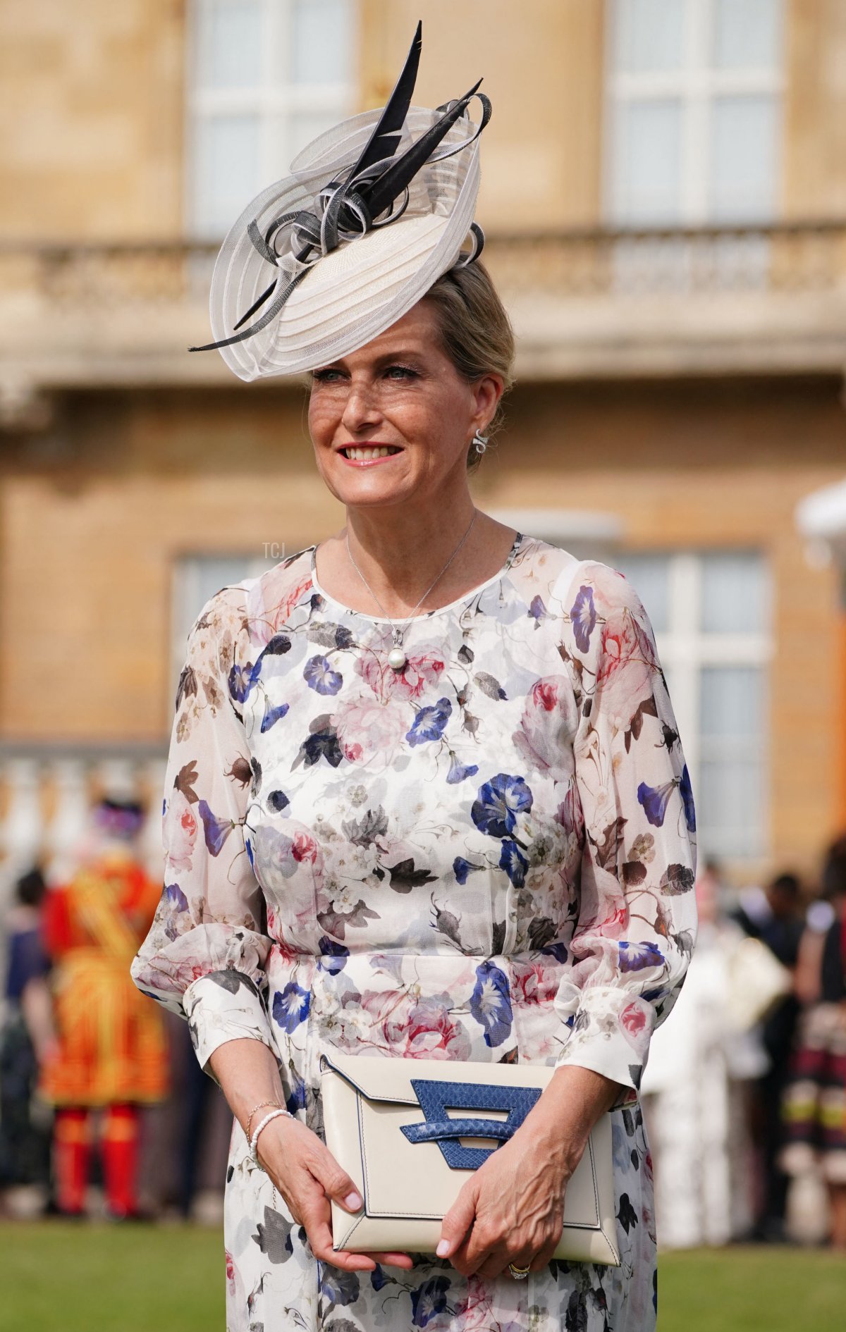 Sophie Wessex wore a floral printed dress and coordinating accessories for the garden party.
