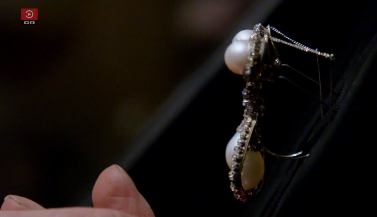We also learn in this episode that Queen Margrethe, like Queen Ingrid before her, does not have pierced ears. The men and women putting together the exhibition note that some of the Queen’s heaviest gala earrings (like those from the Pearl PoirĂ© Parure, pictured above) have support wires to help her bear their weight. The wires, though, make for extra challenges when mounting the jewels for display.