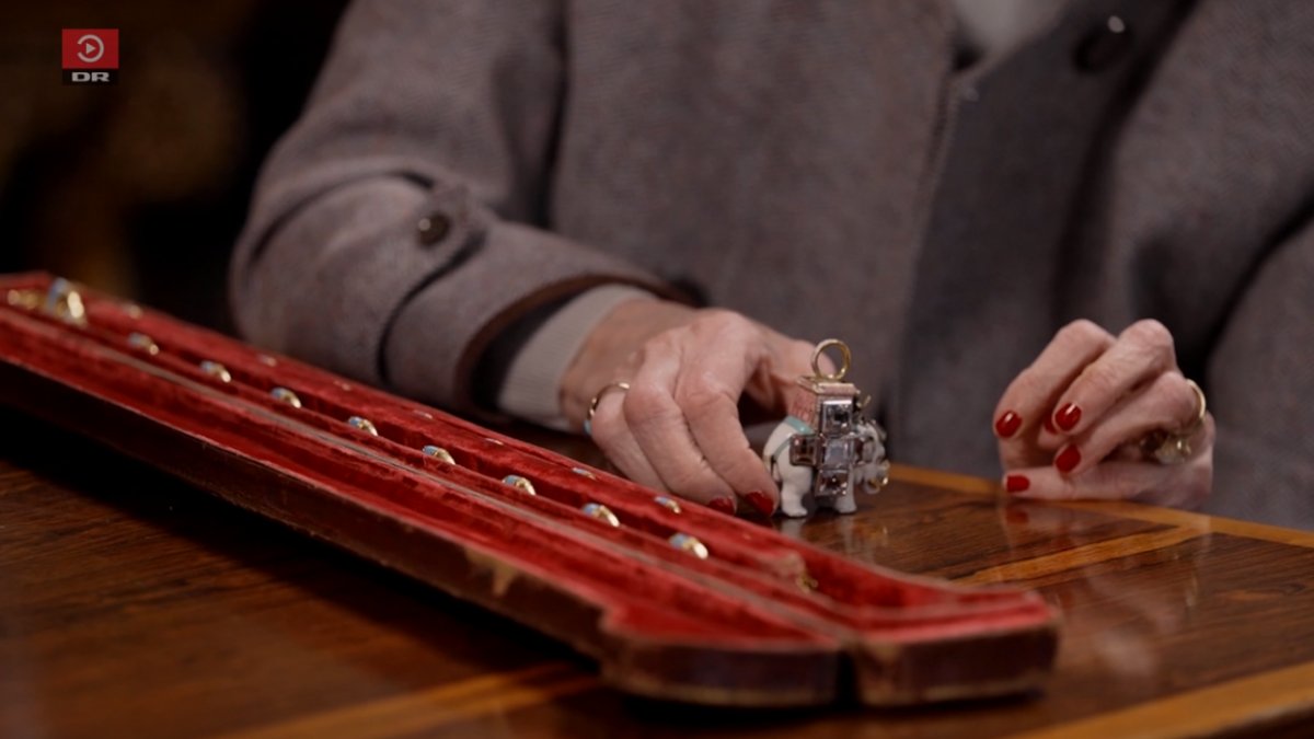 She showcases the special elephant badge made for King Christian V of Denmark, as well as the jeweled collar from which it is suspended. She notes that her father wore this collar and badge, and she also wears it every year for the New Year’s receptions in Copenhagen. The elephant is set with magnificent table-cut diamonds.