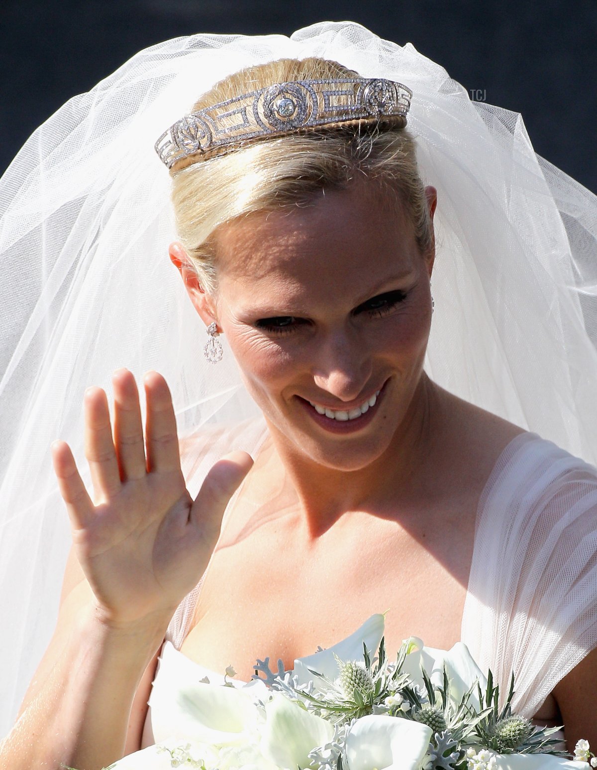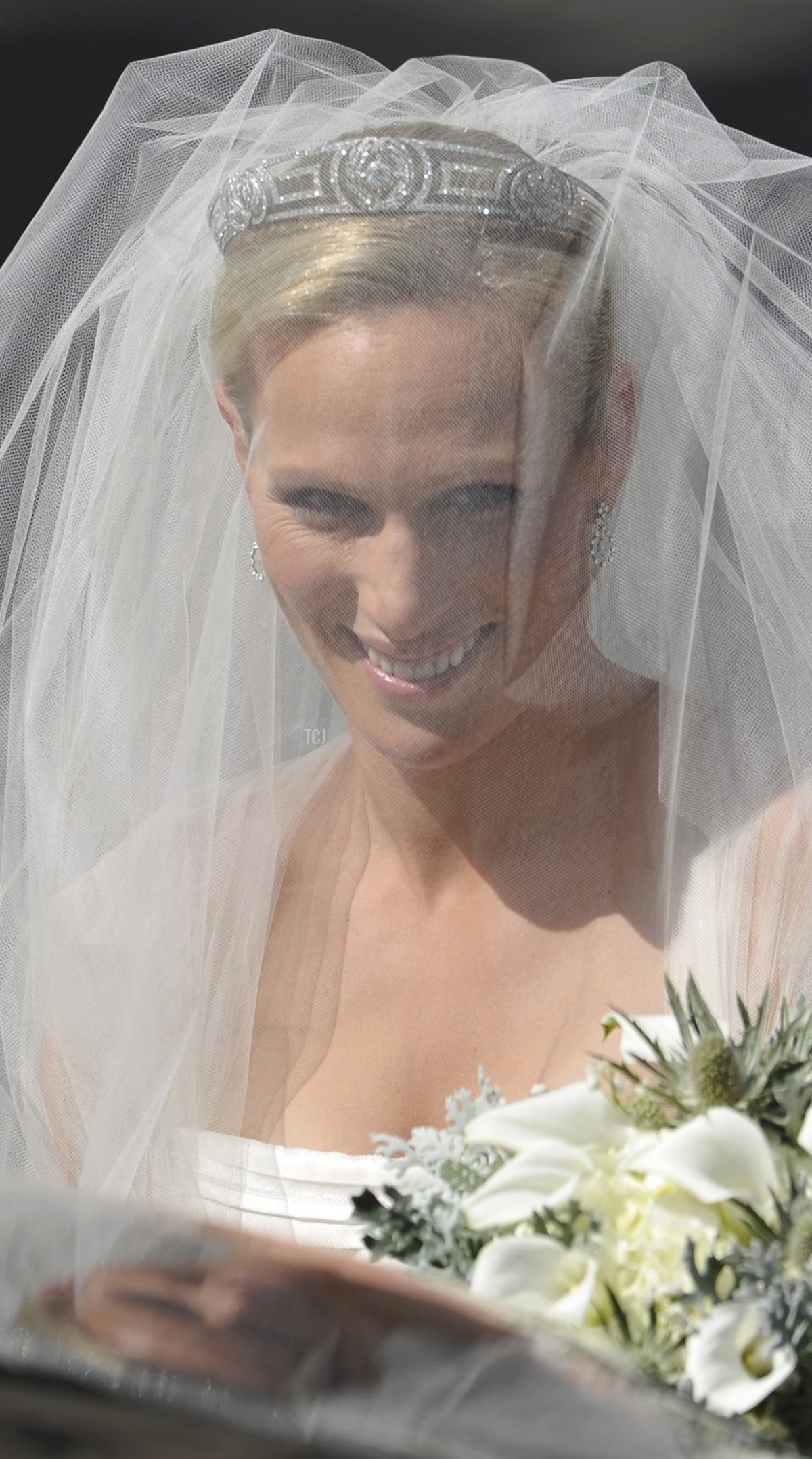 Beneath her tulle veil, Zara wore pieces of antique royal jewelry loaned to her by her mother, Princess Anne.