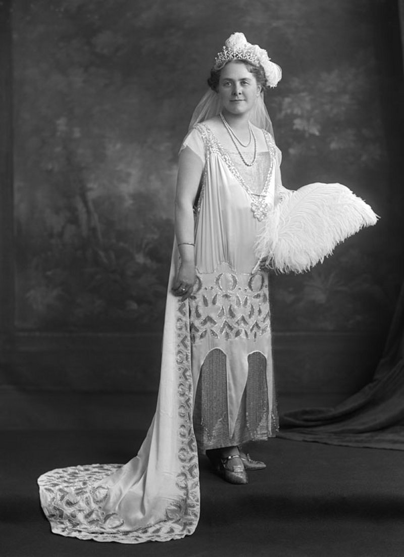 A few months later, in William’s native England, the new Lady Vestey was presented to King George V and Queen Mary at court. The Countess Beauchamp, a granddaughter of the 1st Duke of Westminster, presented her on June 26, 1925. Evelyn wore a diamond tiara with a floral and festoon motif, plus the required ostrich feathers and veil. The Yorkshire Evening Post described her gown at the event: “Lady Vestey’s blue crêpe satin beauté gown has trimmings of gold applique embroidery and diamante. Under the vandyked hem of the gown is an under-dress of gold tissue. A gold tissue lining and gold applique embroideries distinguish the train, which is of blue crêpe satin beauté.”
