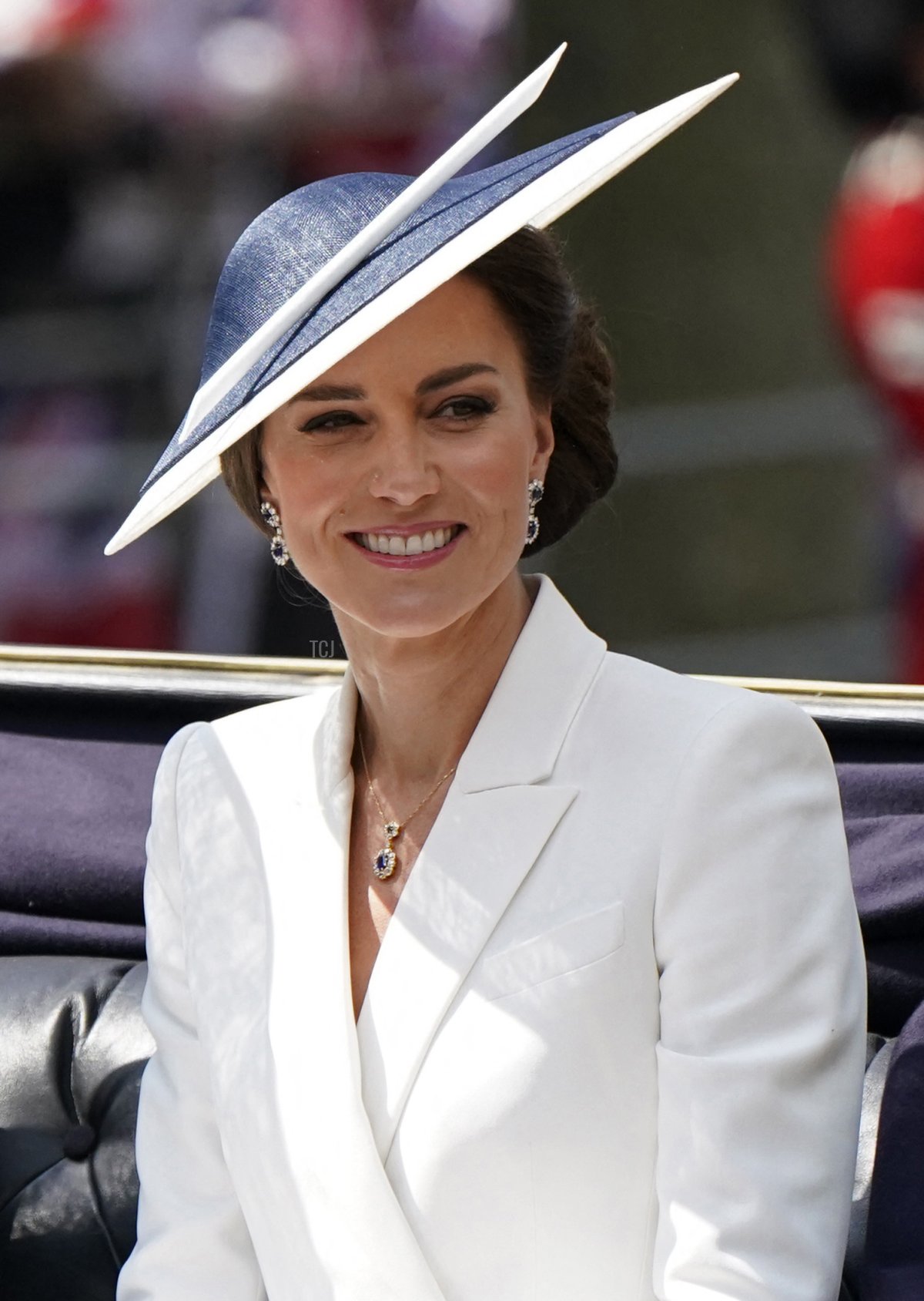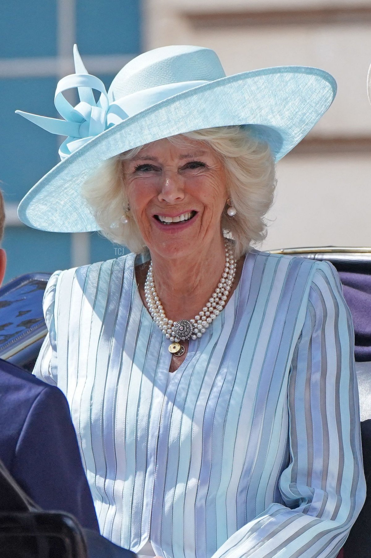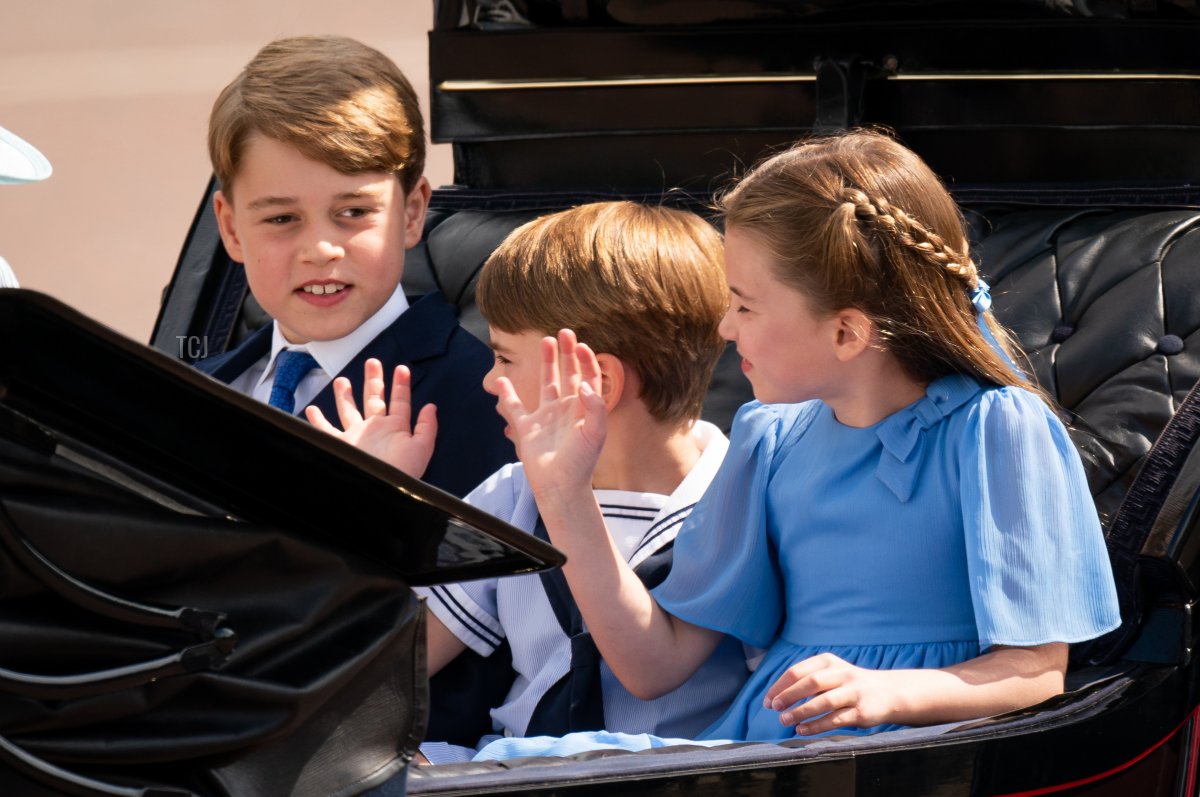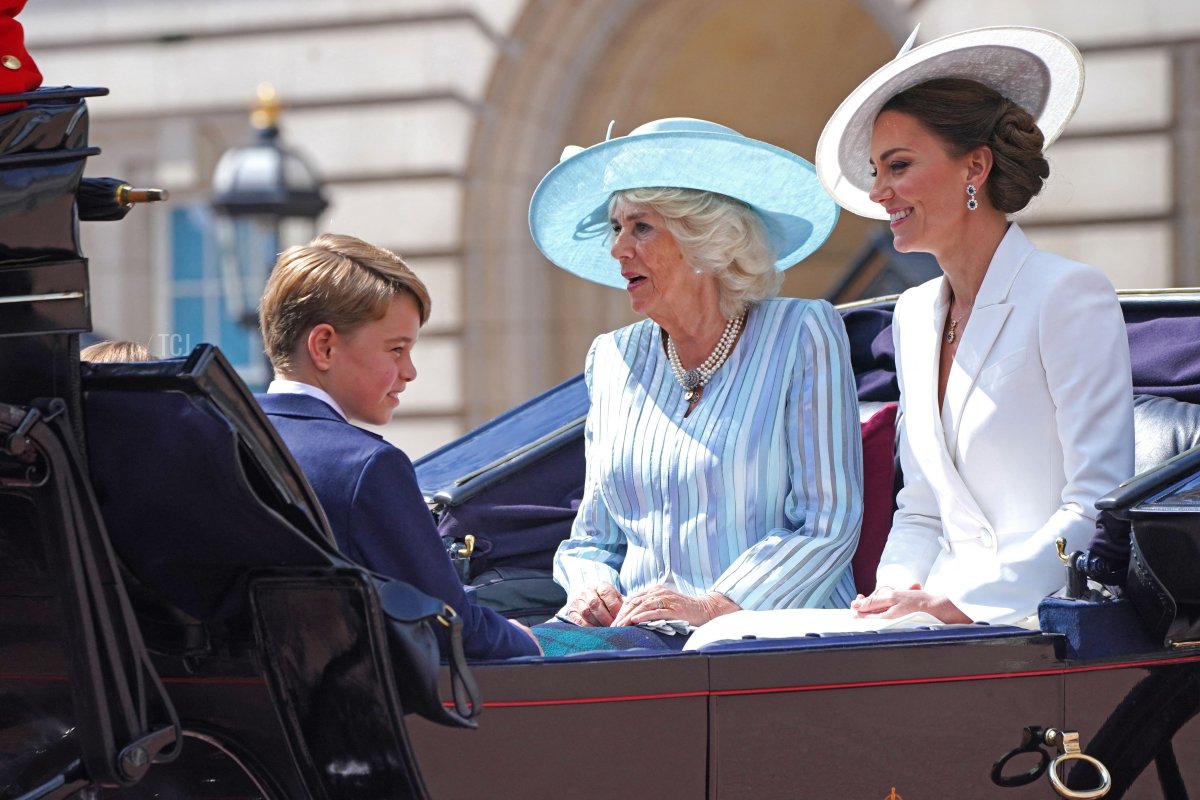 Three carriages carried members of the royal family from the palace to the parade ground for the presentation. In the first carriage, the Duchess of Cornwall and the Duchess of Cambridge rode with three little royals making their first carriage appearance during the event: Prince George, Princess Charlotte, and Prince Louis.