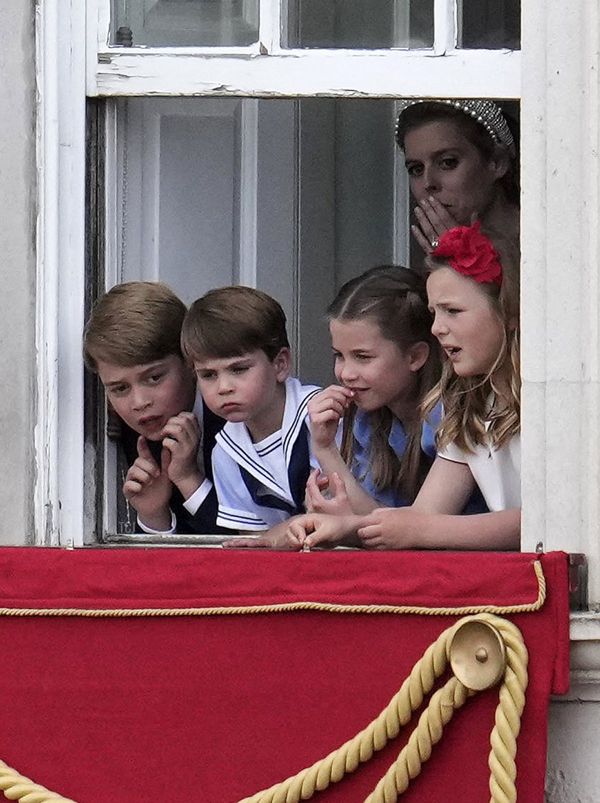 Here’s the full balcony group. From left to right: the Duke and Duchess of Gloucester, Princess Alexandra, the Duke of Kent, Vice Admiral Sir Timothy Laurence, the Princess Royal, the Duchess of Cornwall, the Prince of Wales, the Queen, Prince Louis of Cambridge, the Duchess of Cambridge, Princess Charlotte of Cambridge, Prince George of Cambridge, the Duke of Cambridge, the Countess of Wessex, Viscount Severn, Lady Louise Windsor, and the Earl of Wessex.