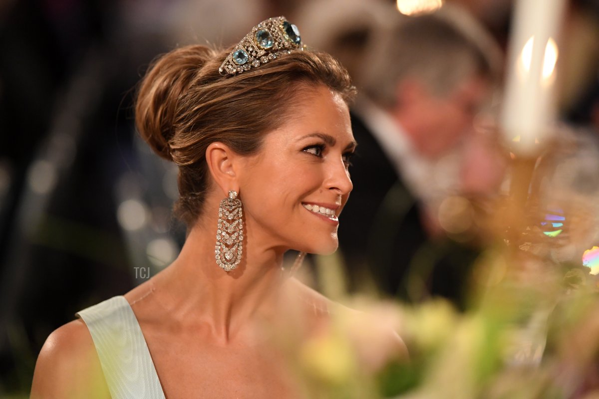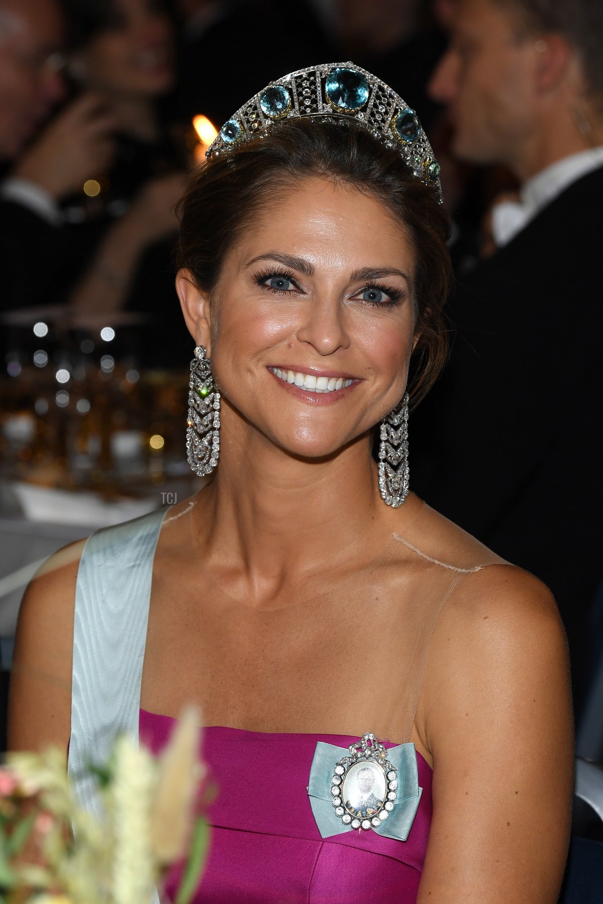 For the Nobel Prize ceremony and banquet in Stockholm in December 2019, Princess Madeleine of Sweden wore a vibrant pink evening gown with an illusion neckline. The star and sash of the Order of the Seraphim and King Carl XVI Gustaf’s Royal Family Order were pinned to the dress.