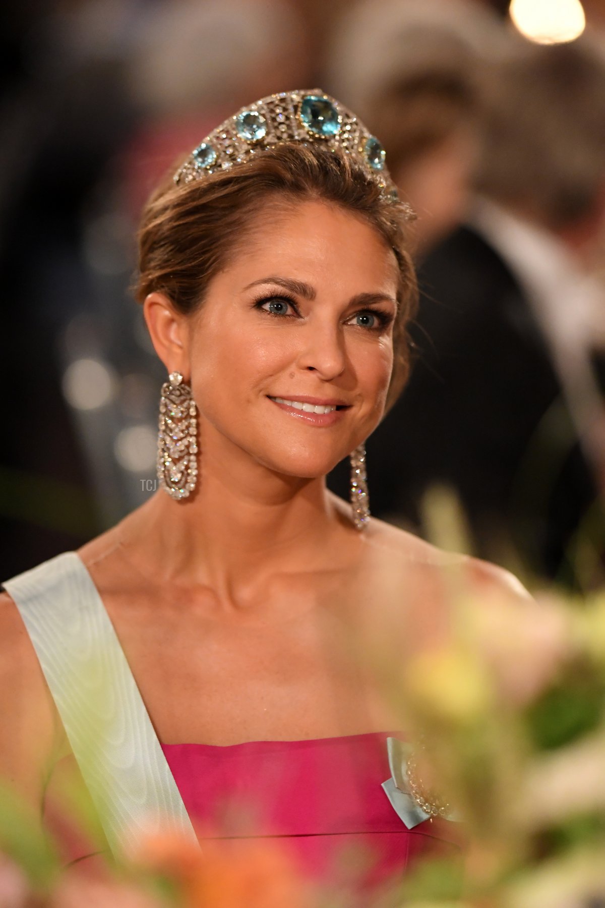 Madeleine echoed the light blue color of the sash and ribbon with her jewels. She wore the Swedish Aquamarine Kokoshnik, a tiara from the collection of her great-grandmother, Princess Margaret of Connaught. The jewel later became associated with her grandmother, Princess Sibylla, who wore it often throughout her life. Today, it belongs to Madeleine’s aunt, Princess Margaretha, who has kindly shared it with other members of the Bernadotte family. It’s become a particular favorite of Princess Madeleine in recent years.