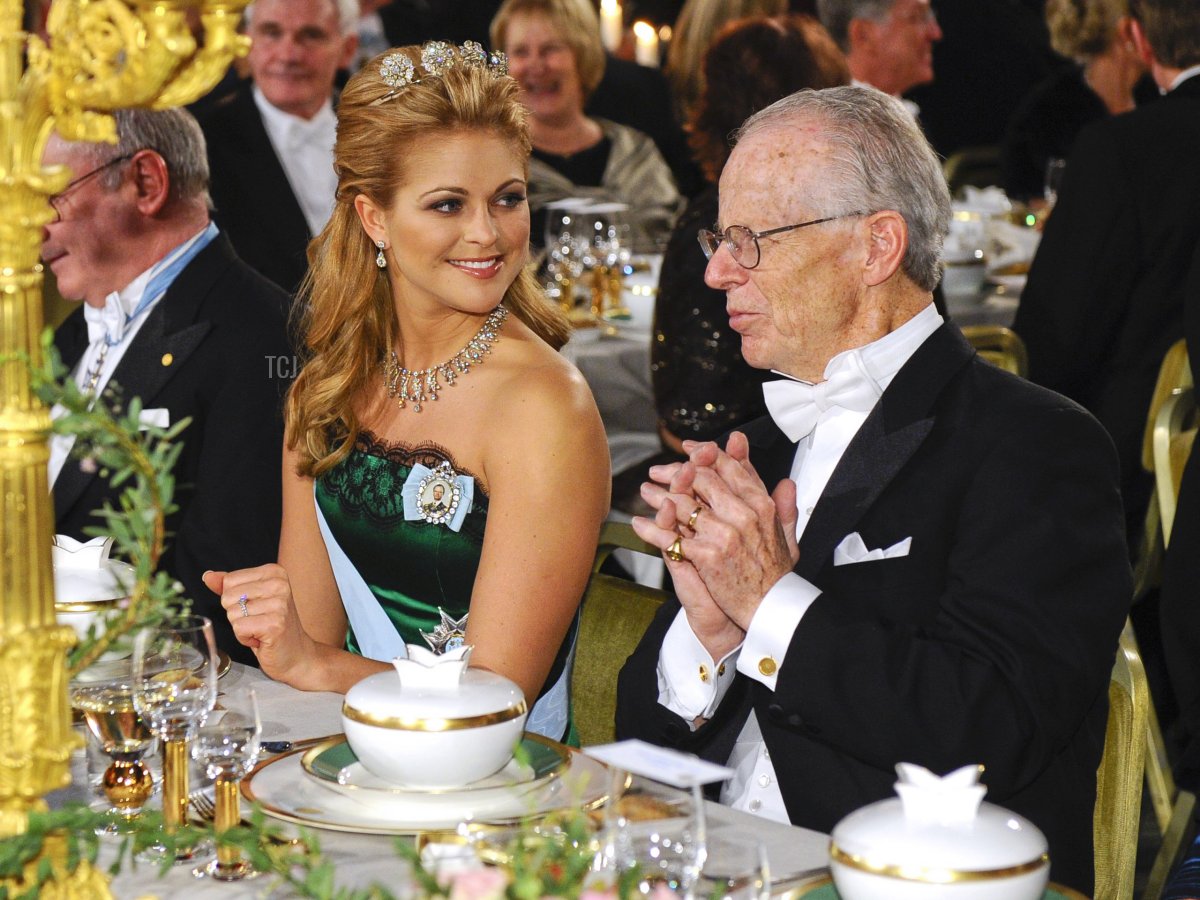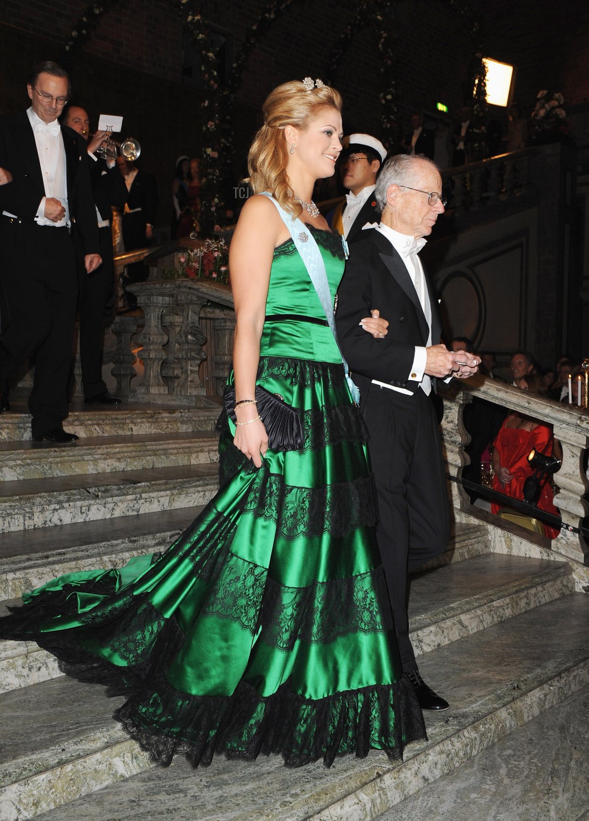 For the Nobel Prize ceremony and banquet in Stockholm in December 2009, Princess Madeleine wore a striking dress made of green satin with black lace accents.