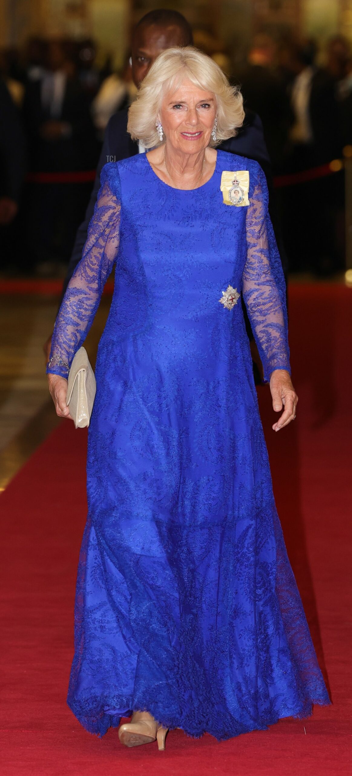 Camilla wore an evening gown in a gorgeous shade of blue with a matching lace overlay. The gown was made by another favorite designer, Bruce Oldfield. Camilla recently wore the same dress for a photograph published in British Vogue, accessorized on that occasion with Princess Marie Louise’s Diamond Sunburst Brooch.