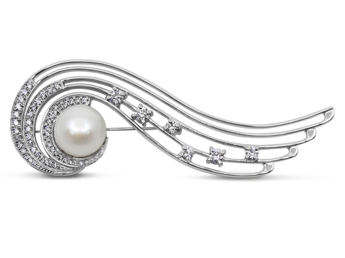 The brooch’s scrolling shape also nods to the 1930s Art Deco architectural style of the philharmonic’s building. Additional diamonds set in platinum swirl around a single round white pearl, which DMR describes as “an ode to Her Majesty’s personal style and jewellery collection.”