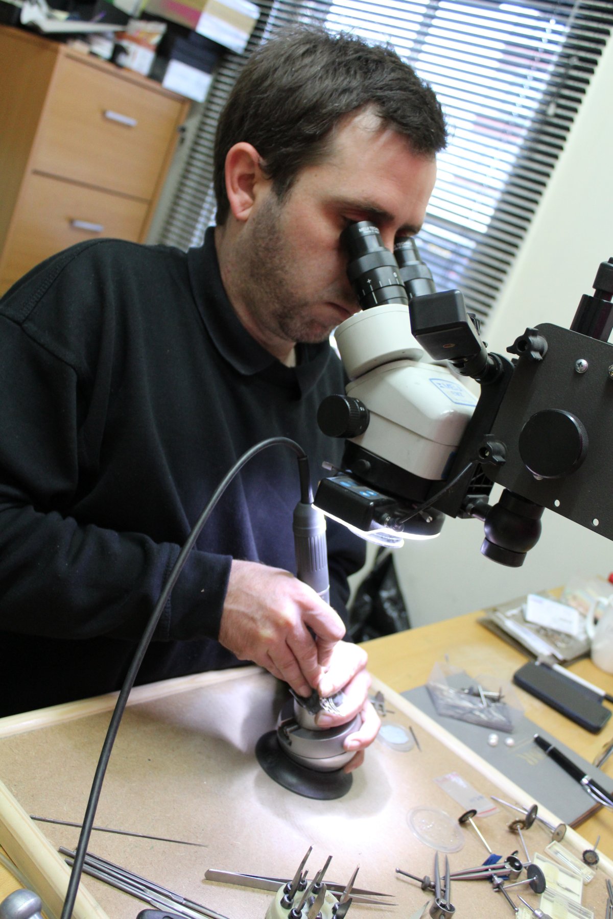 The special jubilee brooch is a collaboration between the Liverpool jewelry firm David M. Robinson and the Royal Liverpool Philharmonic Society. The piece was commissioned by the Royal Liverpool Philharmonic, which has a decades-long association with the monarch. The Queen has been the organization’s patron since 1958. The brooch was made in the DMR workshop in Liverpool. Above, jeweler Alex Pritchard works on the piece.