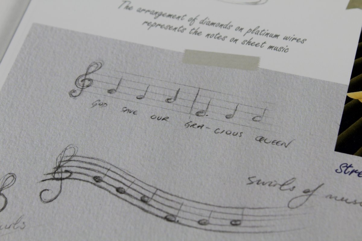 The design of the brooch pays tribute to the Queen’s personal style and legacy, as well as to the music and design of the philharmonic. Set in platinum, of course, the brooch’s shape incorporates a stylized musical staff. Round diamond brilliants represent musical notes—specifically, the opening notes of “God Save the Queen.”