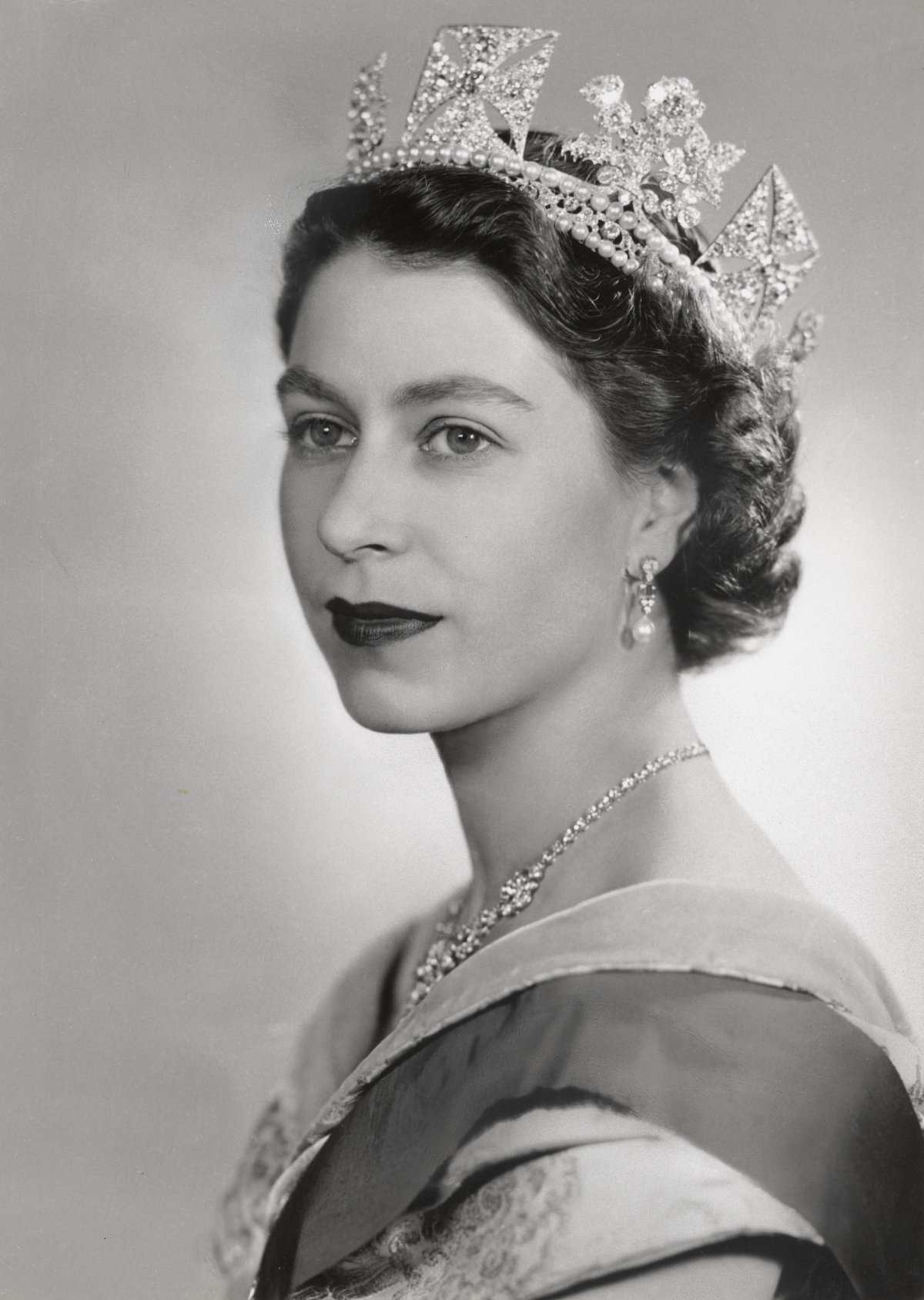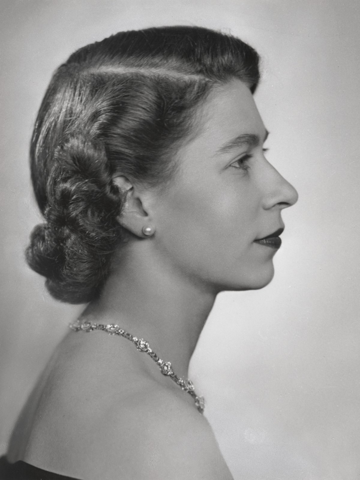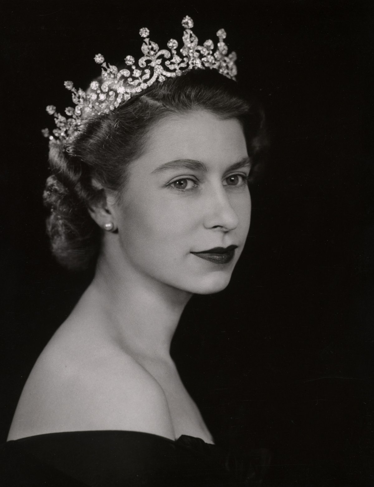 This iconic Wilding portrait was taken a few weeks later, on April 15, 1952. In the photograph, the Queen wears the George IV Diamond Diadem with the Bahrain Pearl Drop Earrings and the Nizam of Hyderabad Necklace.