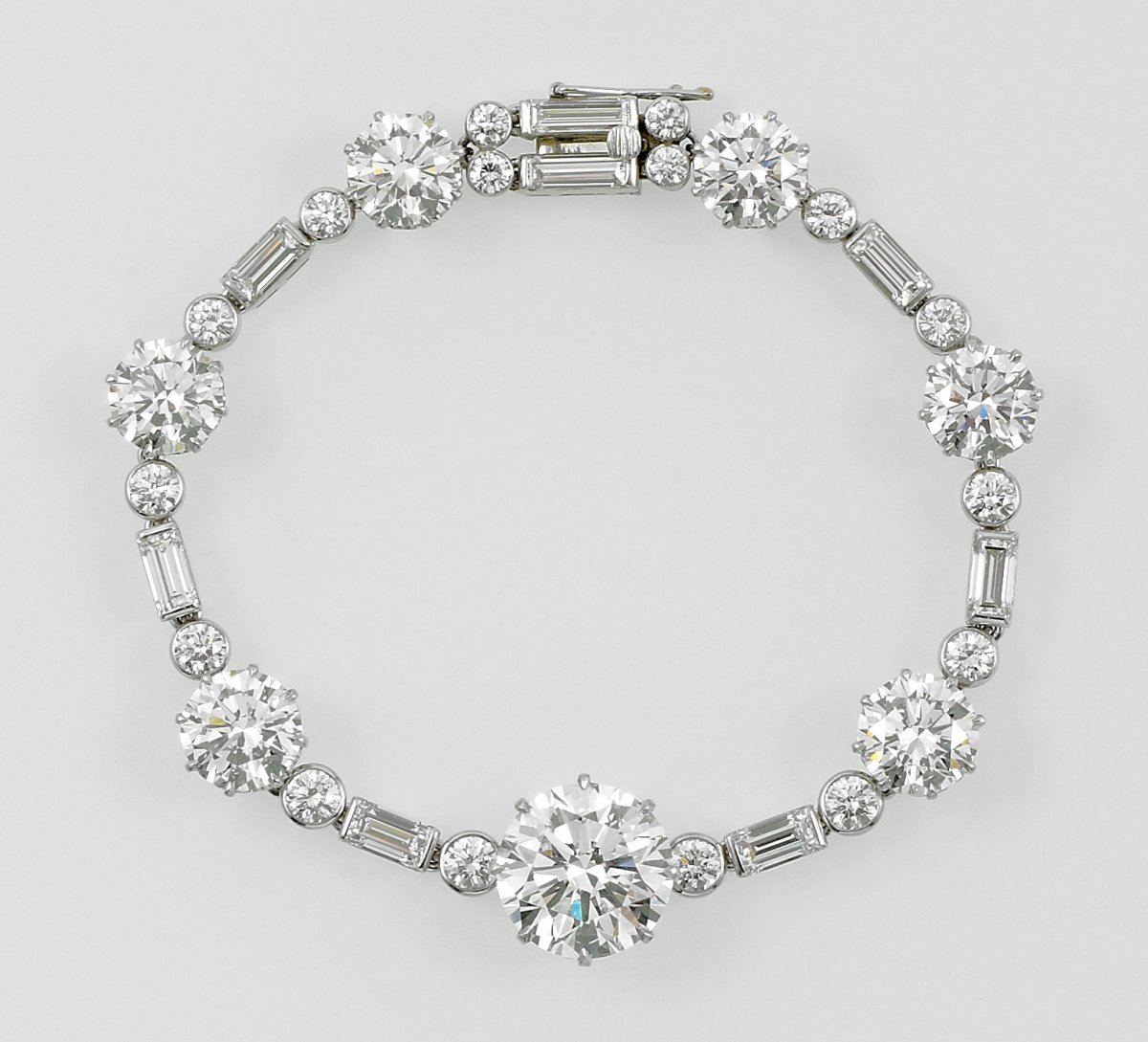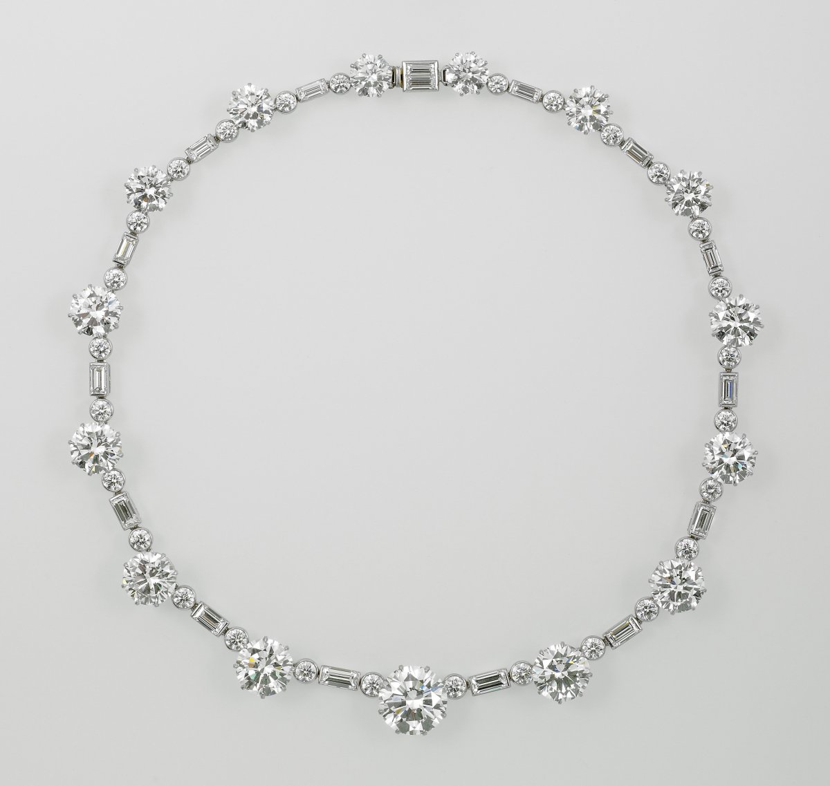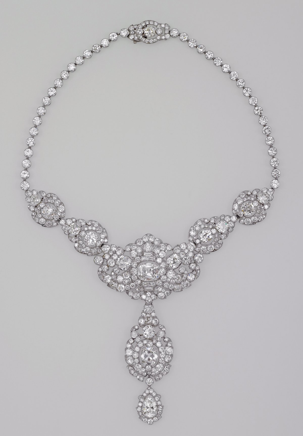 The original necklace was later shortened, and the removed sections were used to make a coordinating bracelet. That piece, shown here, is also included in the exhibition. The Queen has called the necklace and bracelet her “best diamonds.”