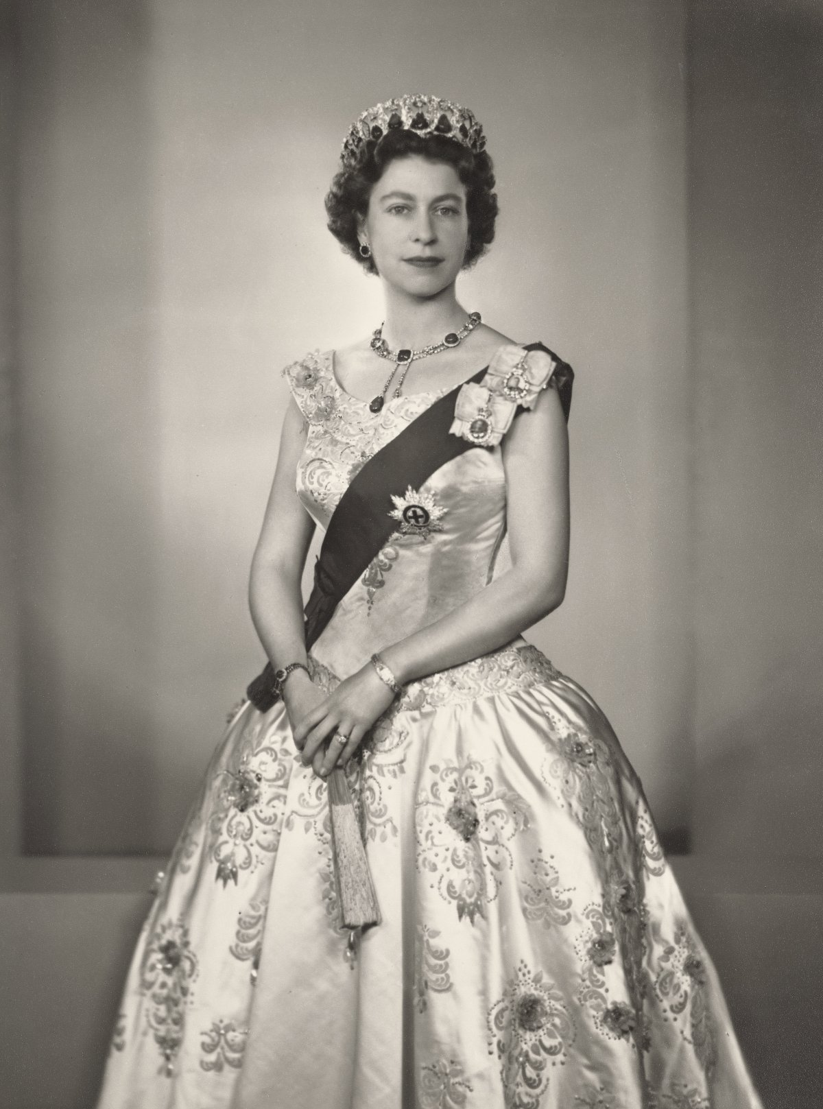 One of Wilding’s last portraits of the Queen was this image, taken in May 1956. In the portrait, the Queen wears an evening gown with orders and decorations, plus the Vladimir Tiara and jewels from the Delhi Durbar Parure.