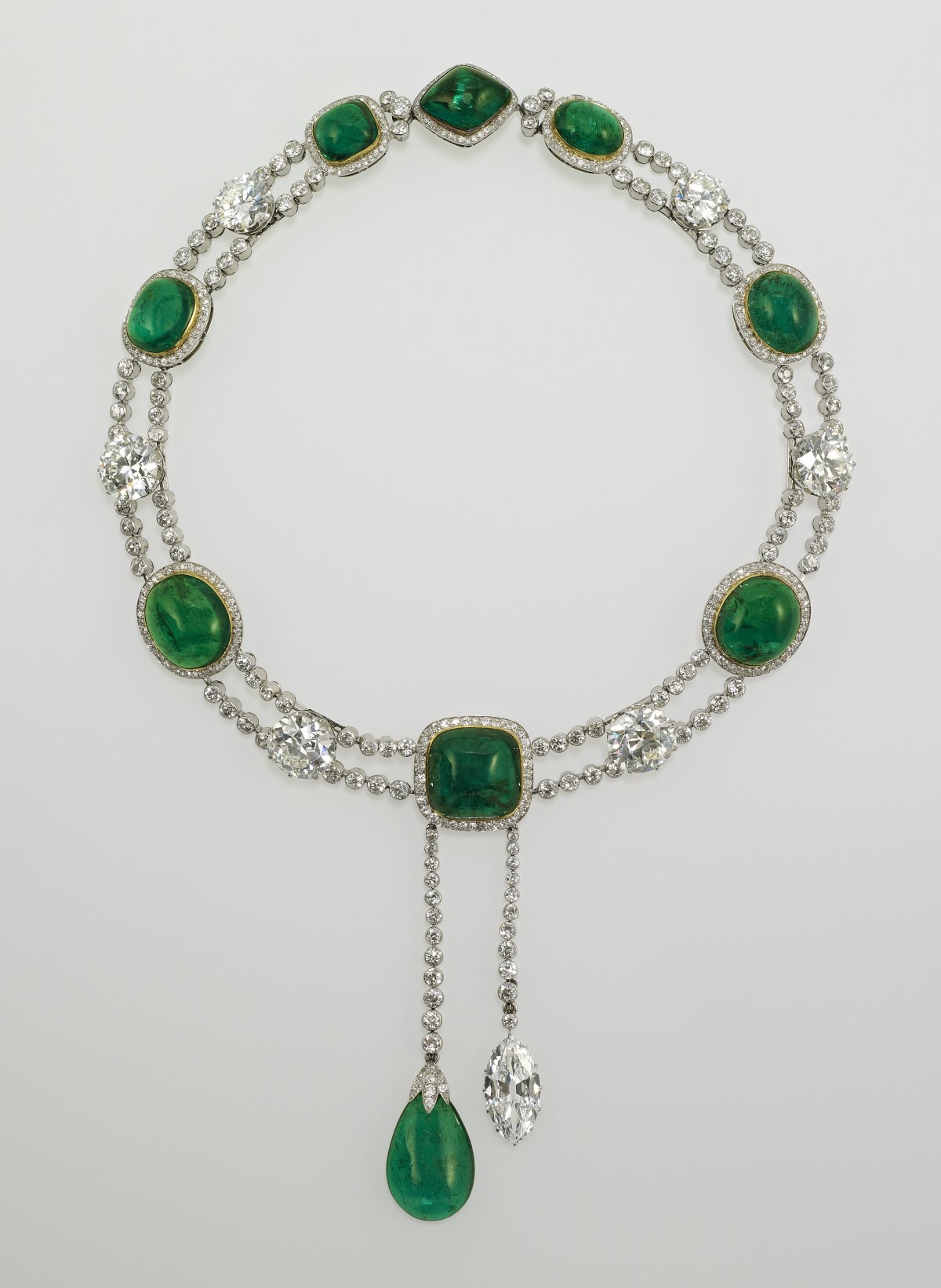 The necklace from the Delhi Durbar Parure is also featured in the exhibition. The jewel, made in 1911 for Queen Mary to wear at the Delhi Durbar in India, is set with stones from the Cambridge Emerald and Cullinan Diamond collections. The necklace’s coordinating earrings are also on display.