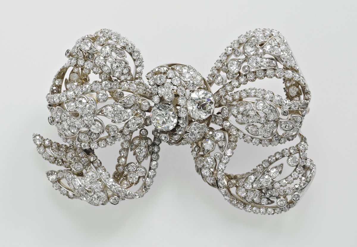 There are also additional pieces from the Queen’s jewelry collection on display. The jewels are all pieces that she began wearing during the early years of her marriage and her reign. Here’s the Dorset Bow Brooch, another of Queen Mary’s wedding gifts, which was made by Carrington in 1893.