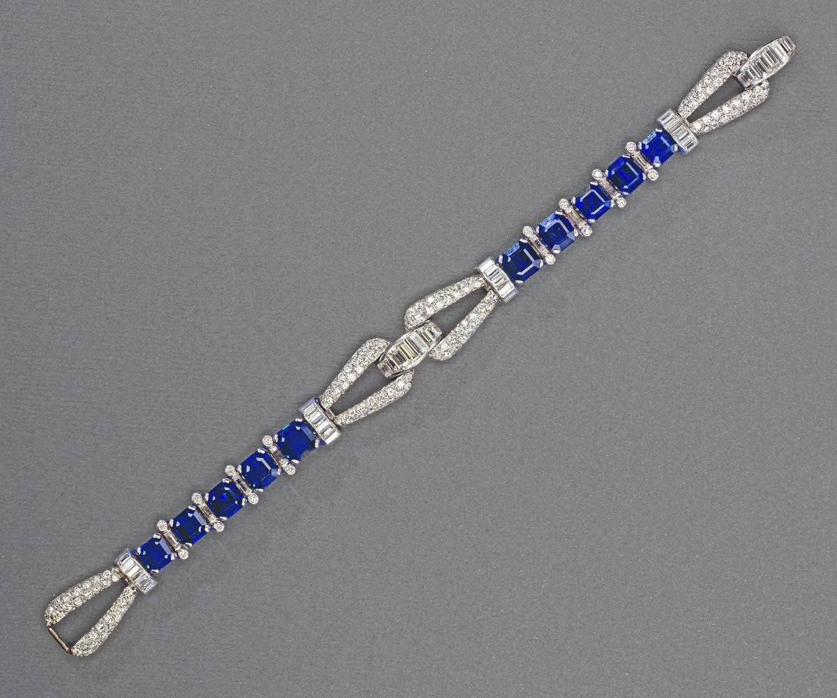 The exhibition also includes this sentimental sapphire and diamond bracelet. It was given to Princess Elizabeth by her father, King George VI, as an 18th birthday present in April 1944. The bracelet was a vintage piece, made by Cartier around 1920.