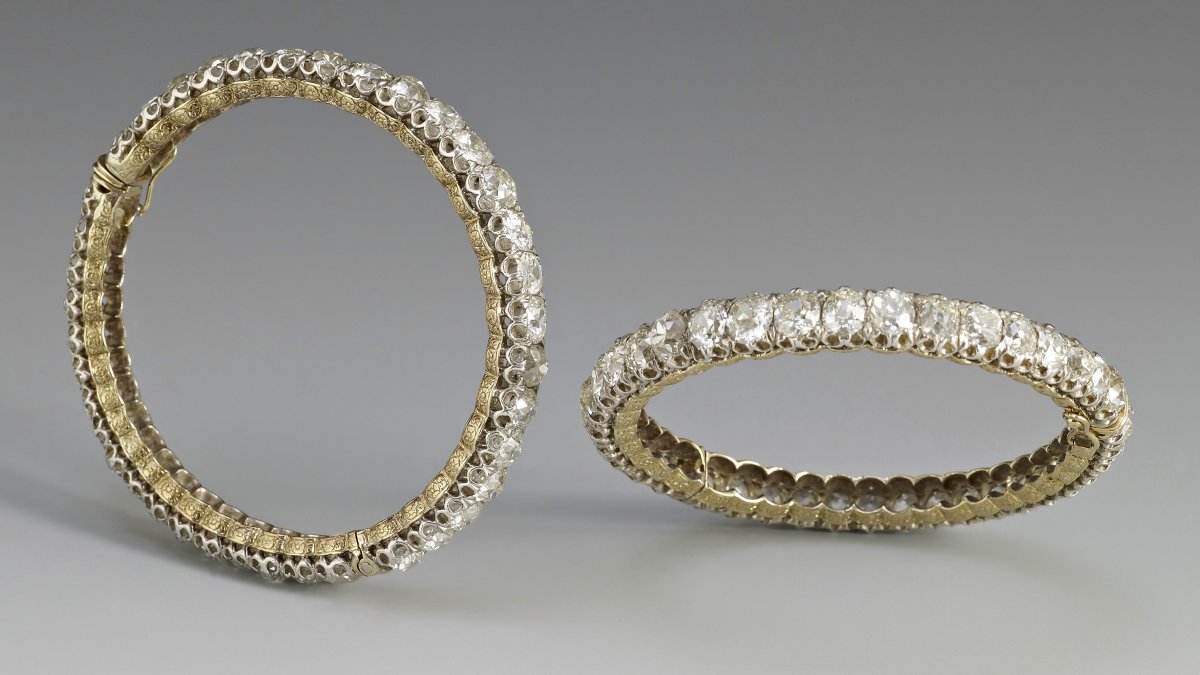 A pair of diamond bangles that belonged to Queen Mary are on display as well. The traditional Indian bangle bracelets were given to Mary as a wedding present by the Bombay Presidency in 1893. In turn, Queen Mary offered the bangles to Princess Elizabeth as a wedding present in 1947.