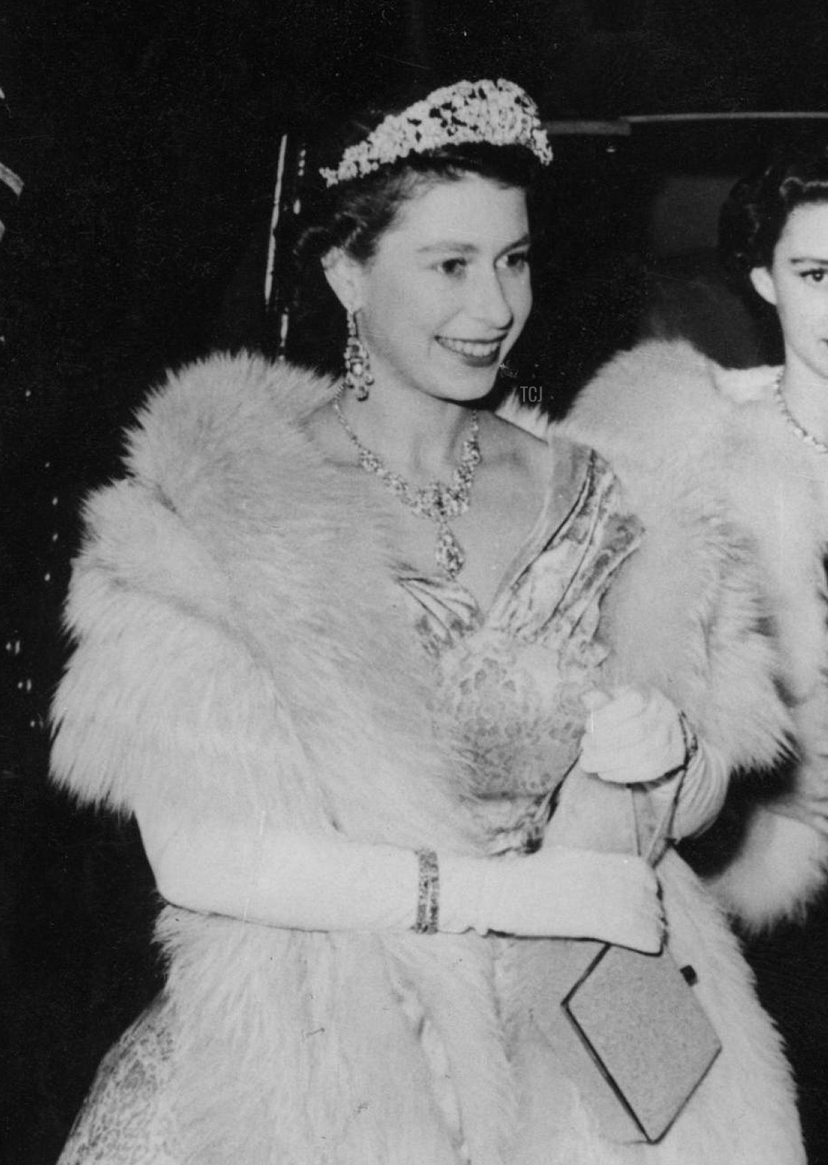 Here, a young Queen Elizabeth II wears the bangles on her right wrist at the Royal Variety Performance in 1952. She’s also wearing the Nizam of Hyderabad Tiara and Necklace, plus the Greville Chandelier Earrings.